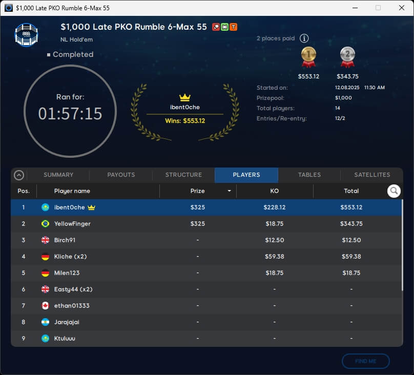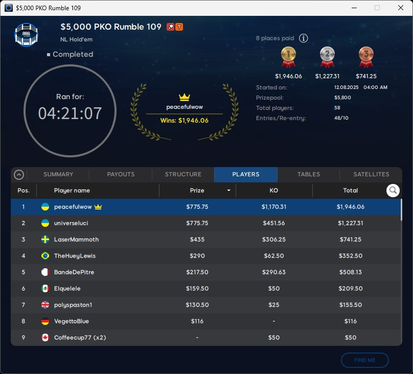Mit am Start war auch cool_Cat888. Den Spieler aus Deutschland erwischte es auf Rang 4, was ihm $2.975 einbrachte. Im Heads-up setzte sich Wahlmaltese NekoManeki ($9.004,07) gegen FraerVV29 (2./$8.380,06) aus der Ukraine durch.