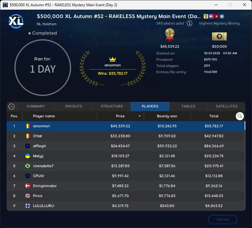 Zu Tag 2 im $250 Mystery Bounty Main Event kehrten acht Spieler zurück. Mit amormori ($55.782,17) und 01tdr (2./$42.947,82) machten zwei Rumänen den Sieg unter sich aus. afflegit, der sich an Day 1 die $50k-Bounty sichern konnte, belegte Platz 3 und ging mit $84.366,69 vom Tisch.