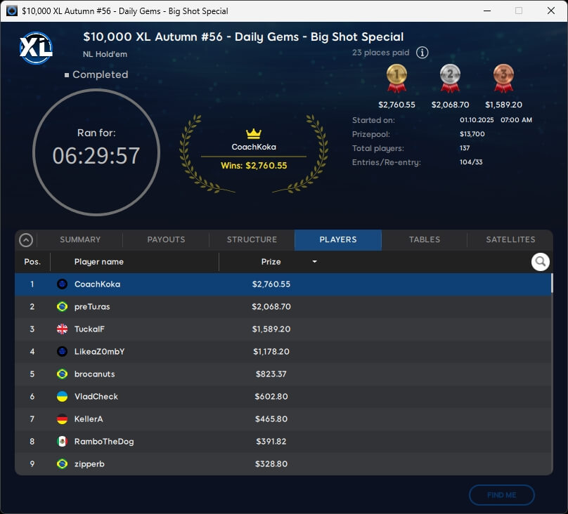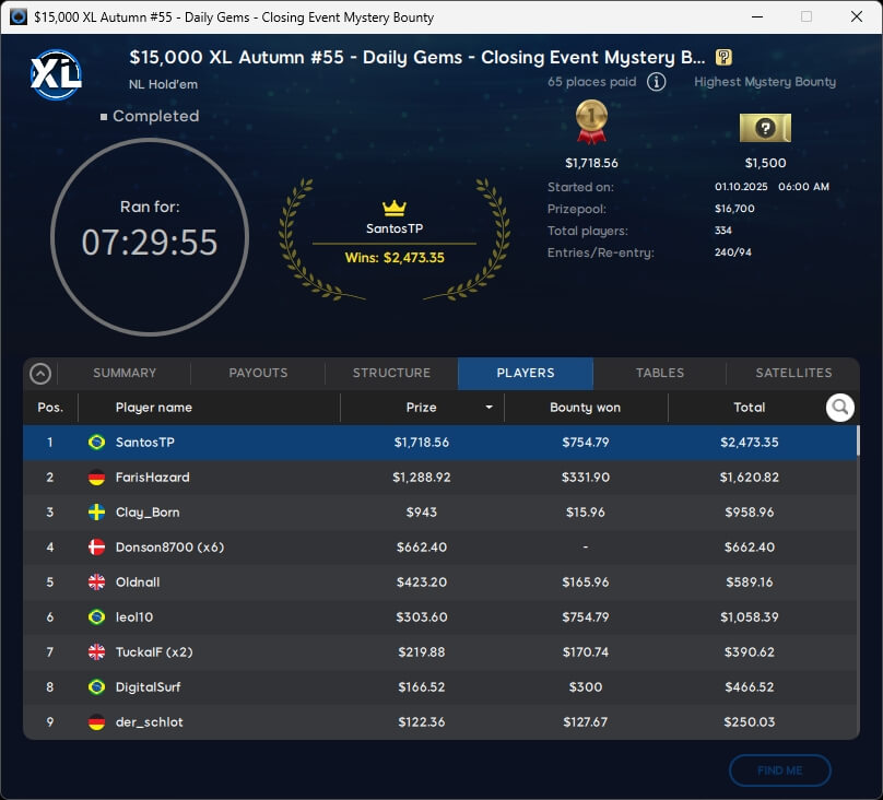 Für CPU0r endete das Main Event auf Rang 6, was inklusive Kopfgeldprämien $12.112,88 einbrachte. Mit FarisHazard (2./$2.473,35) schrammte die DACH-Gemeinde knapp an einem weiteren XL-Sieg im $55 Closing Event Mystery Bounty vorbei.