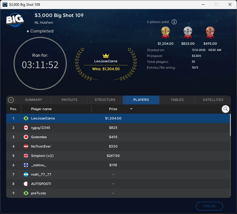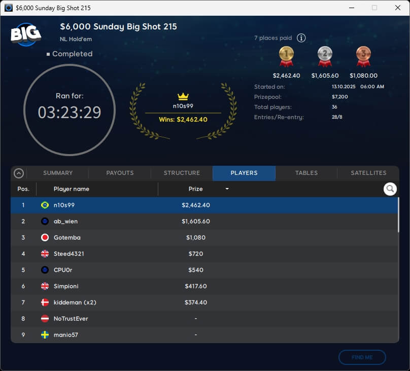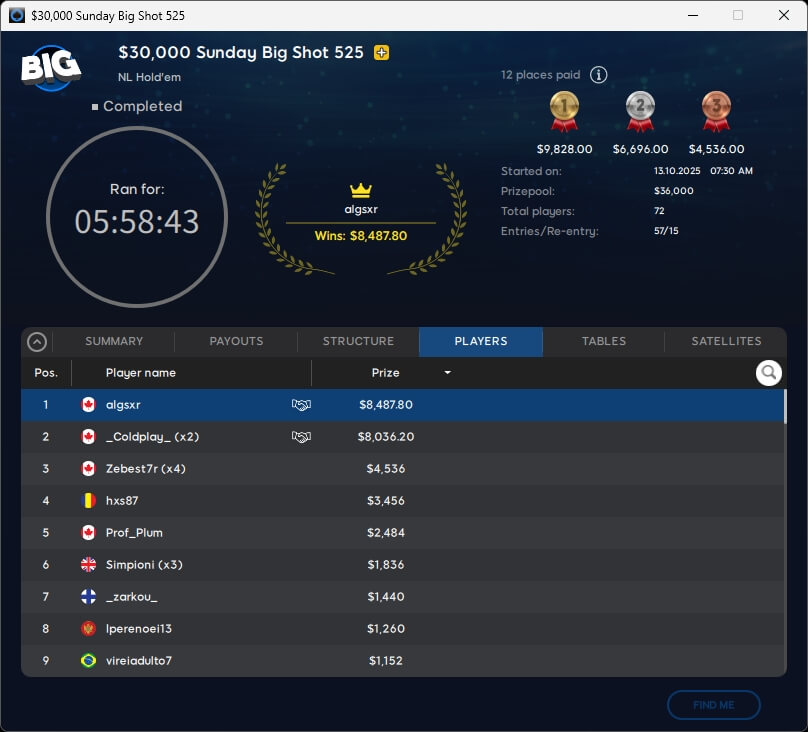 Im $525 Sunday Big Shot machten nach einem Heads-up-Deal algsxr ($8.487,80) und Coldplay (2./$8.036,20) das Turnier unter sich aus. 888poker-Markenbotschafter Ian „Simpioni“ Simpson (6./$1.836) gehörte ebenfalls zu den Finalisten.