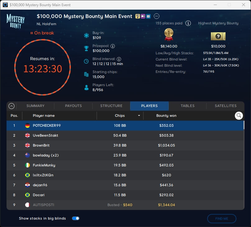 Im $109 Mystery Bounty Main Event gibt es noch keine Entscheidung. 761 Spieler und 195 Re-Entries reichten nicht aus, um die $100.000 GTD zu knacken. Der Schwede LaserMammoth (24./$11.544,04) schnappte sich die $10k-Bounty. Beste Chancen auf den Sieg hat POTCHECKER99 aus Deutschland, der als Führender in die Entscheidung geht.