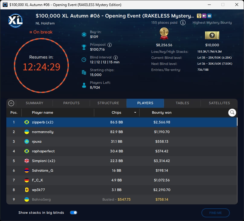 Ian Simpson war bei den regulären MTTs erfolgreich. Der 888poker-Markenbotschafter holte das $109 Sunday PKO Rumble ($2.319,64). Simpson schaffte es zudem an den Final Table im $109 Opening Event Mystery Bounty. Ebenfalls um den Sieg mitspielen wird F_C_K aus Deutschland.