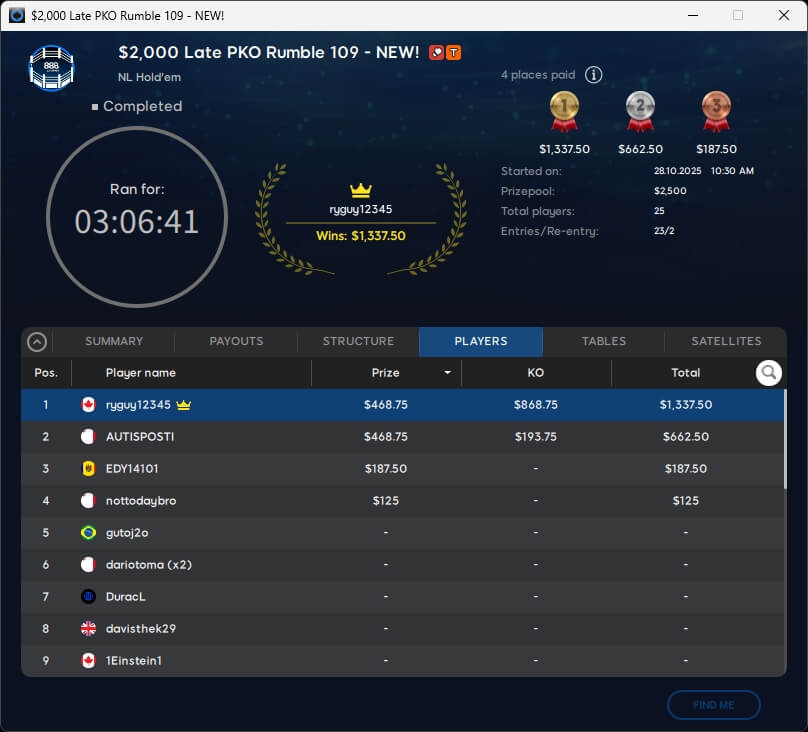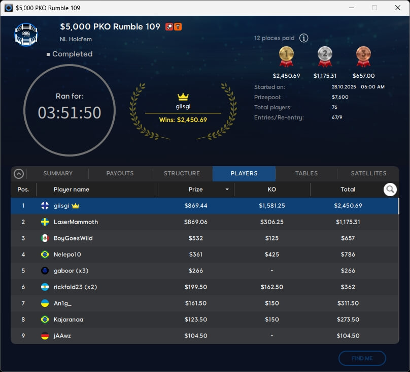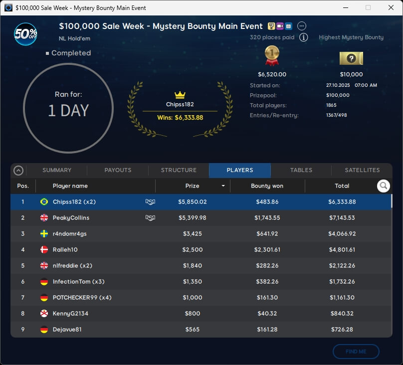 Den Sieg sowie insgesamt $6.333,88 schnappte sich am Ende Chipss182 aus Brasilien. Aufgrund eines Heads-up-Deals ging Runner-up PeakyCollins mit $7.143,53 vom Tisch. Großer Gewinner bleibt damit Tallguy1000 (78./$10.215,97), der an Day 1 die $10k-Bounty holen konnte.