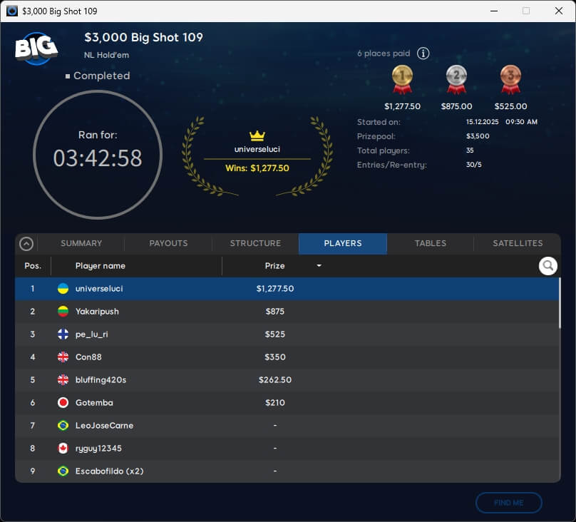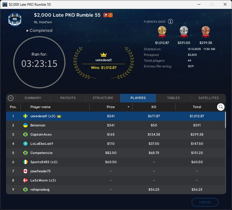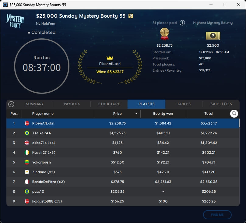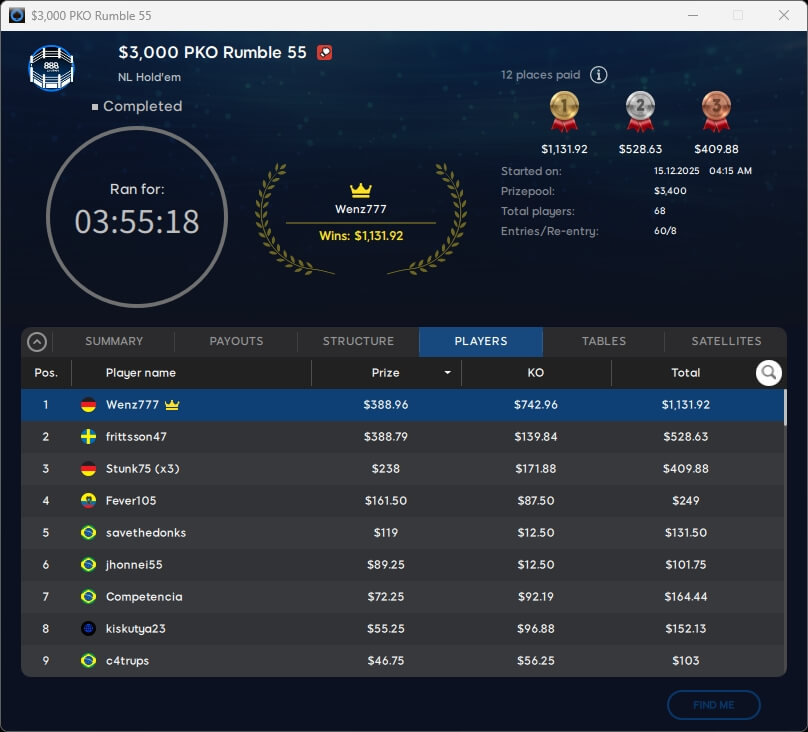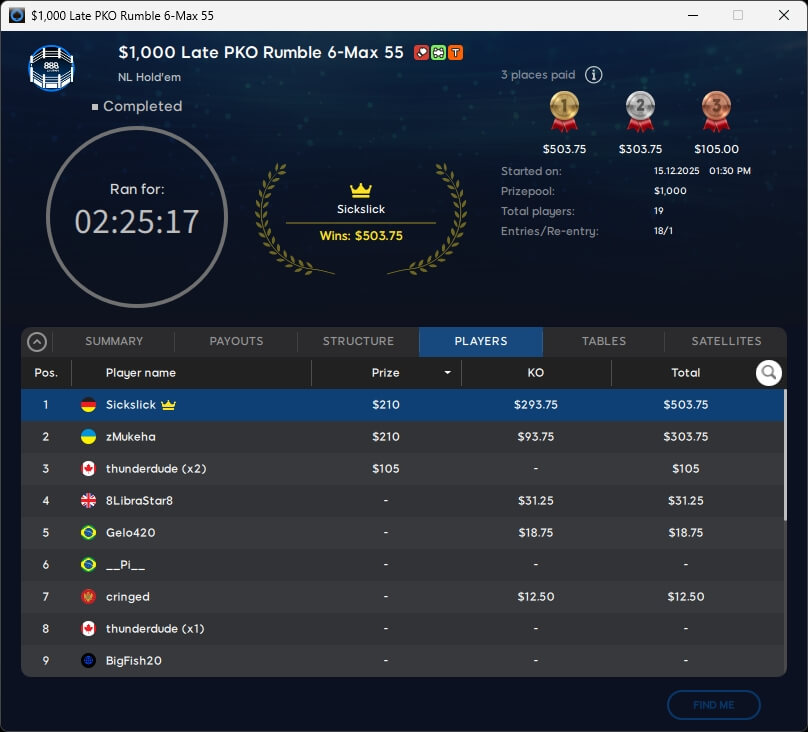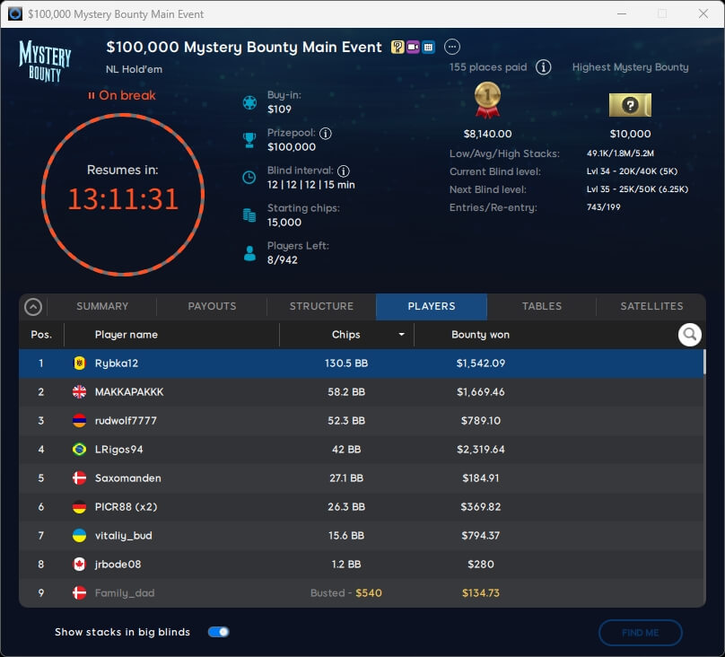 Keine Entscheidung gab es im $109 Mystery Bounty Main Event. Zu den acht Finalisten gehört auch PICR88 aus Deutschland, der von Platz 6 aus in die Entscheidung geht. Die $10k-Bounty ist bereits ausgespielt und ging an den Kanadier Bountyhunt1 (106./$10.250).