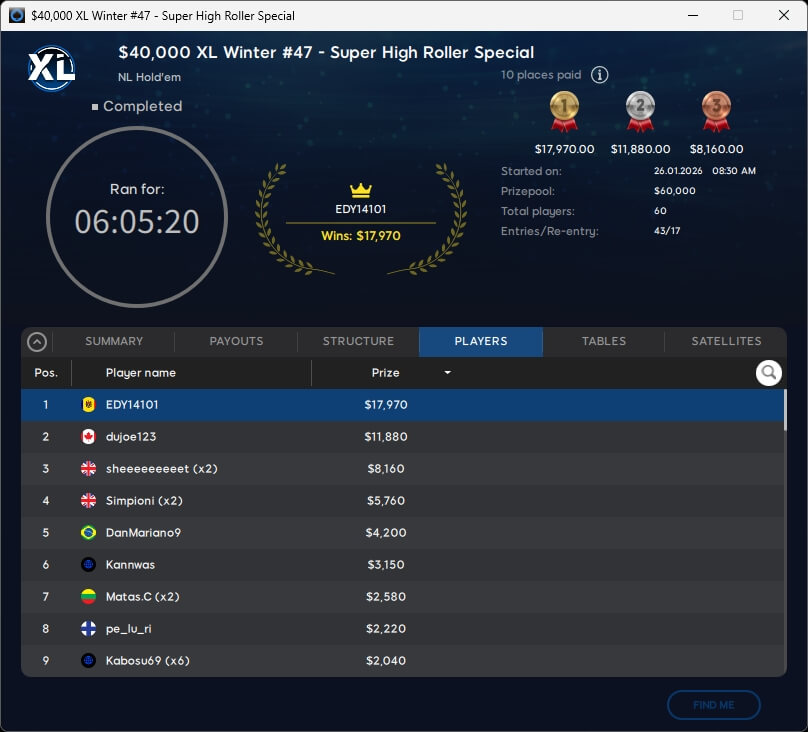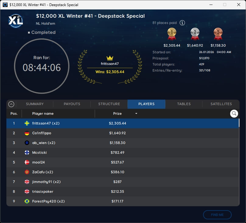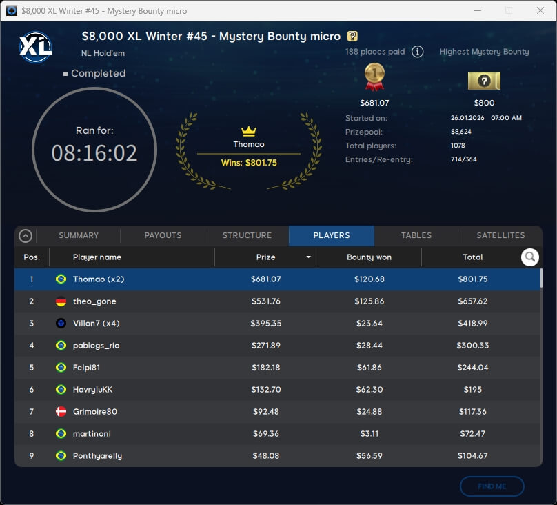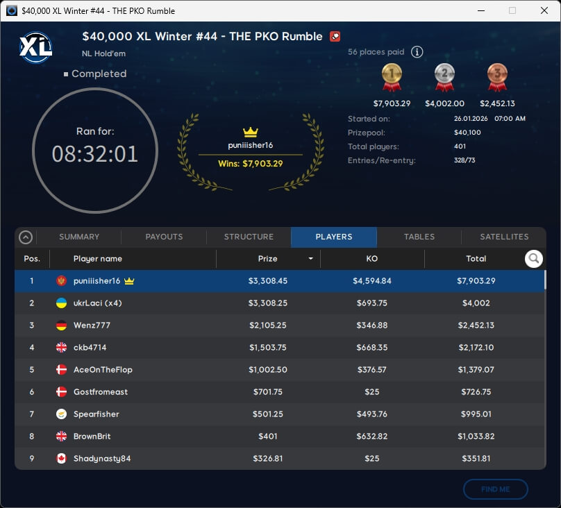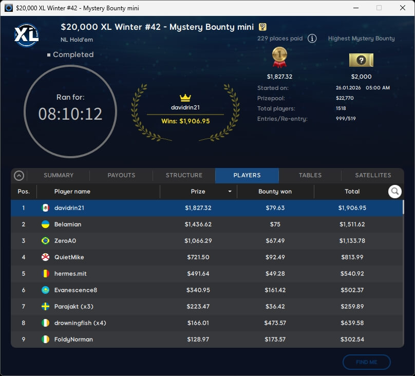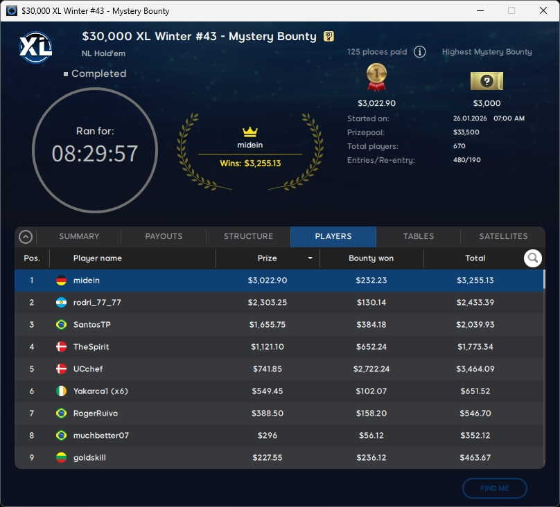 Die DACH-Gemeinde verbuchte bei der XL Winter Series einen erfolgreichen Sonntag. midein ($3.255,13) spielte im $55 Mystery Bounty einen Sieg ein. Co1nfl1ppo (2./$1.640,92; $33 Deepstack Special), theo_gone (2./$657,62; $8,80 Mystery Bounty Micro) und Wenz777 (3./$2.452,13; $109 PKO Rumble) landeten auf dem Treppchen.
