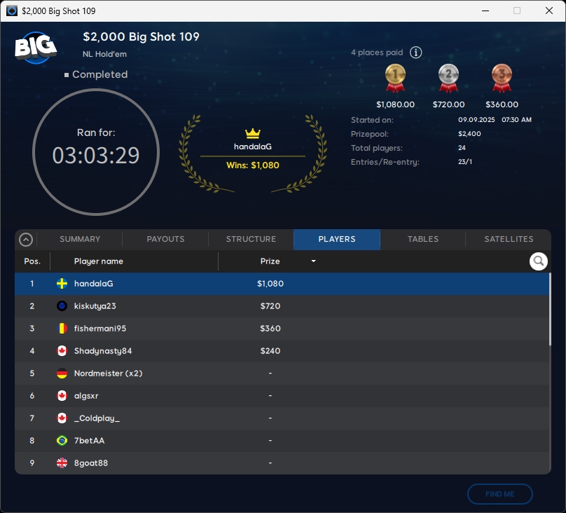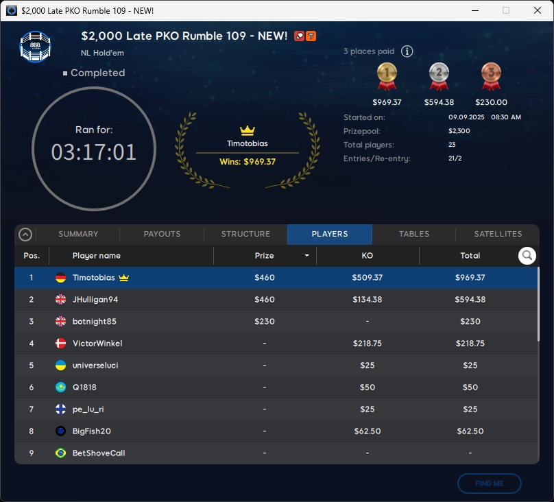 Die deutschsprachige Poker-Community verbuchte bei den Side Events Deep Runs. Timotobias ($969,37; $109 Late PKO Rumble) sicherte sich einen Turniersieg. Knapp an einem Titel vorbeigeschrammt sind PhilThe00 (2./$1.405,37; $109 PKO Rumble Daily Gems) und Nordmeister (3./$306,80; $55 PKO Rumble).