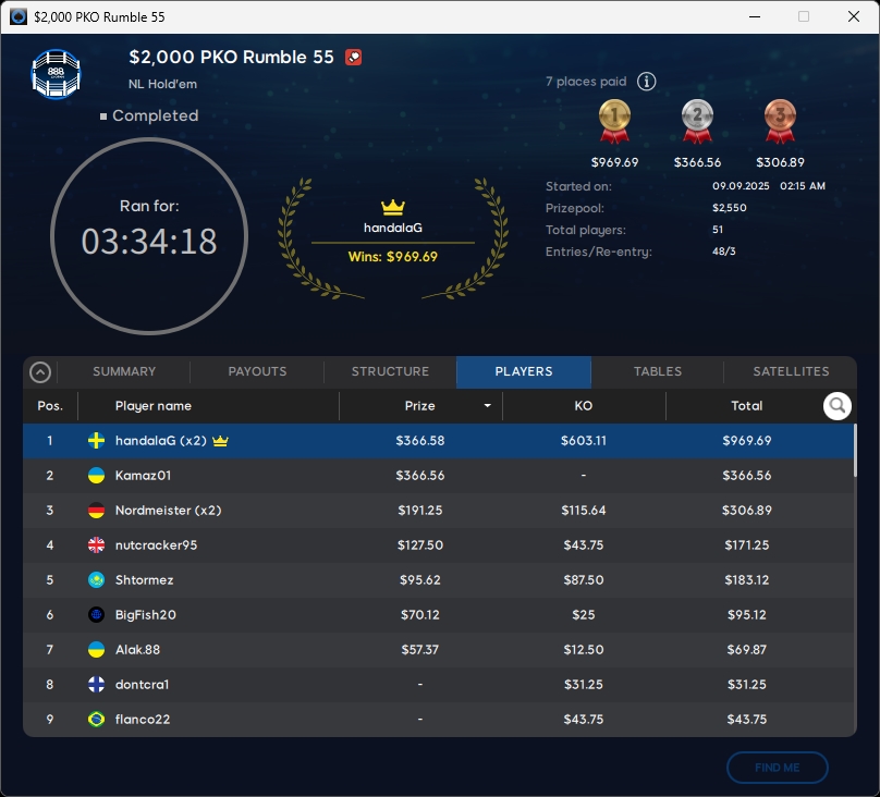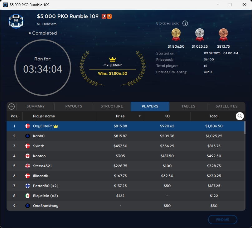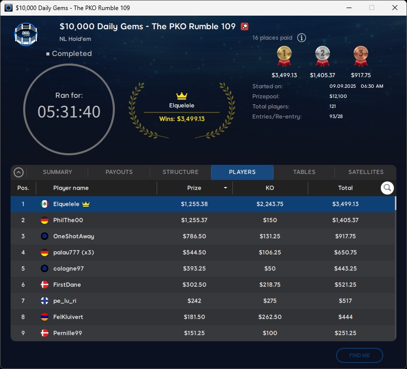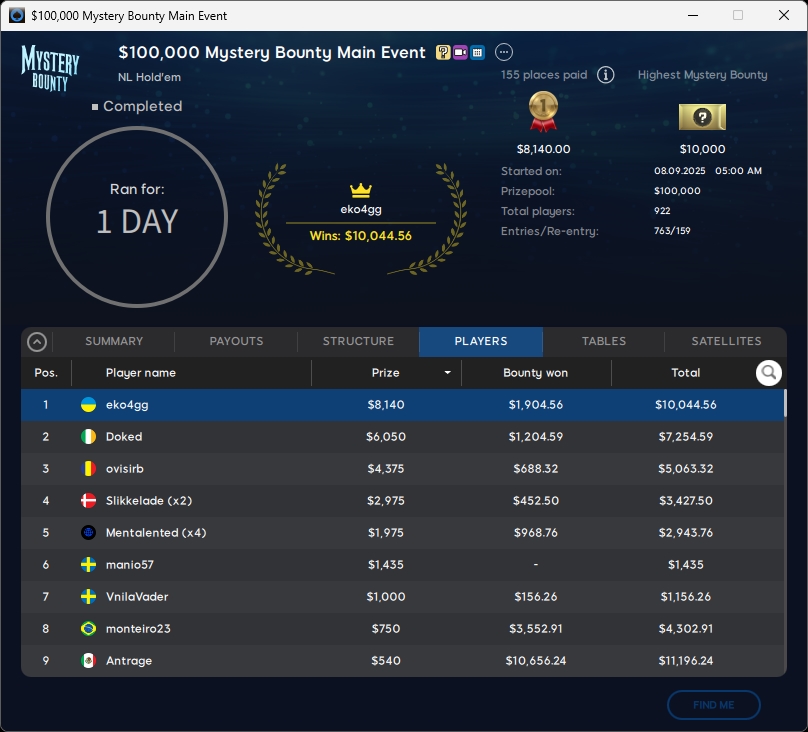 Zu Tag 2 im $109 Mystery Bounty Main Event kehrten sieben verbliebene Spieler auf 888poker zurück. Den Titel sicherte sich eko4gg ($10.044,56) aus der Ukraine. Runner-up wurde Doked ($7.254,59), Rang 3 ging an ovisirb ($5.063,32).