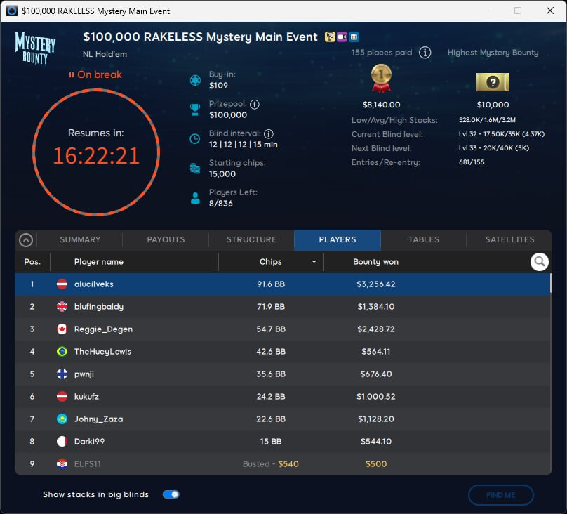 Im $109 RAKELESS Mystery Main Event reichten 681 Starter und 155 Re-Entries nicht aus, um die $100.000 GTD zu knacken. Der Schwede Gladius1337 (40./$10.229,11) sicherte sich die $10k-Bounty. Acht verbliebene Spieler werden heute um den Titel kämpfen.