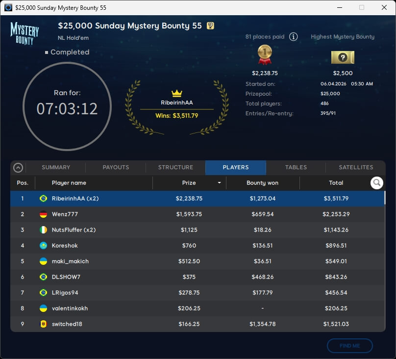 Im $525 Sunday Big Shot spielten 38 Teilnehmer um $24.000 an Preisgeldern. Nach 3-Way-Deal setzte sich uaredead1 ($5.899,72) gegen Appiah_1 (2./$5.268,69) und SpielerKind (3./$5.079,59) durch. Im $55 Sunday Mystery Bounty schrammte Wenz777 (2./$2.253,29) aus Deutschland knapp am Titel vorbei.