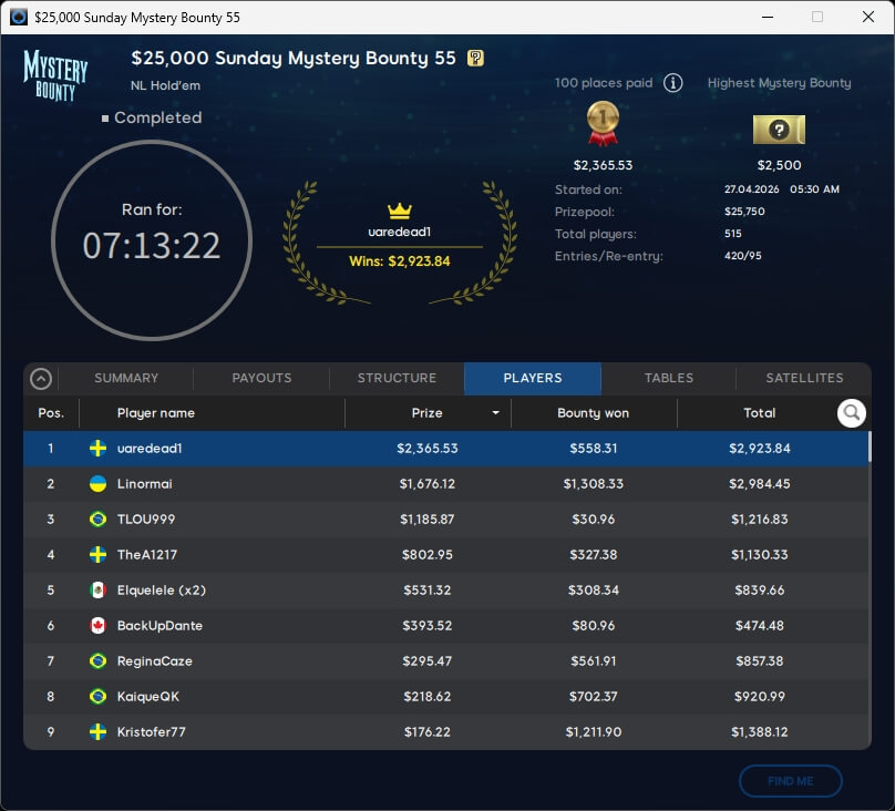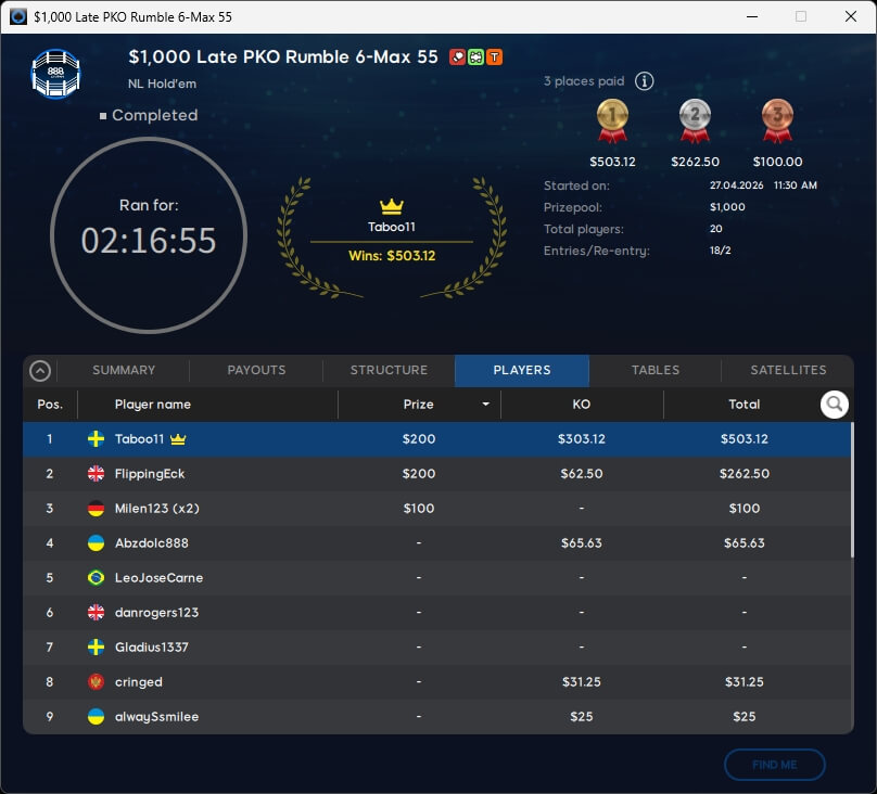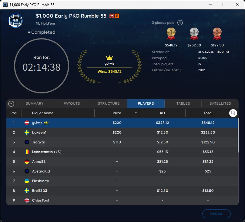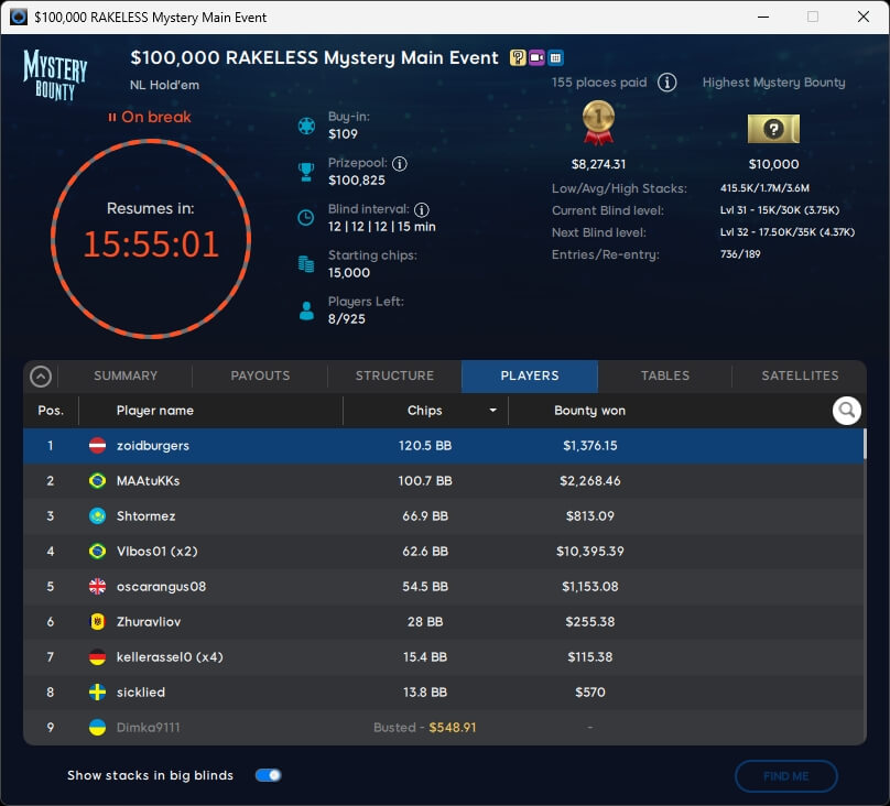 Zum $109 RAKELESS Mystery Bounty Main Event traten 736 Teilnehmer an. 189 Re-Entries knackten dann die Garantie, so dass um $100.825 gespielt wurde. Die $10k-Bounty ist bereits geknackt.