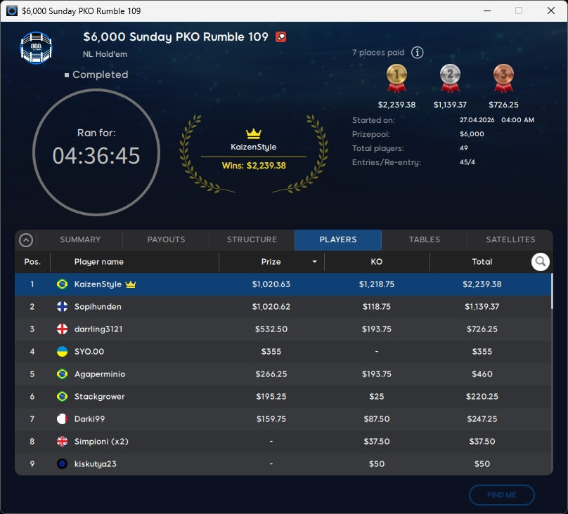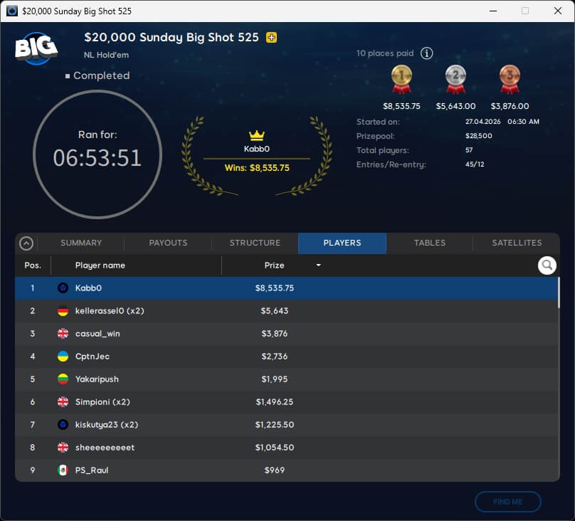 Der Turniersonntag auf 888poker brachte die gewohnte Action. Das teuerste Turnier des Tages war das $525 Sunday Big Shot. Dort spielten 45 Starter um $28.500 an Preisgeldern. Am Ende setzte sich Kabb0 ($8.535,75) gegen kellerassel0 ($5.643) durch.