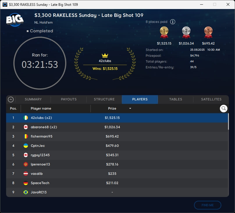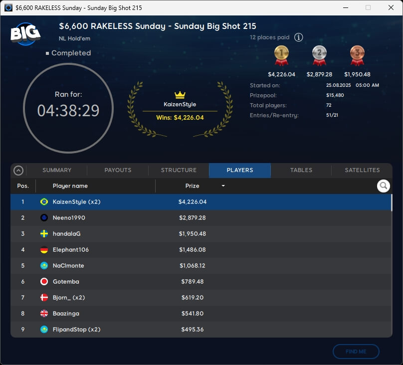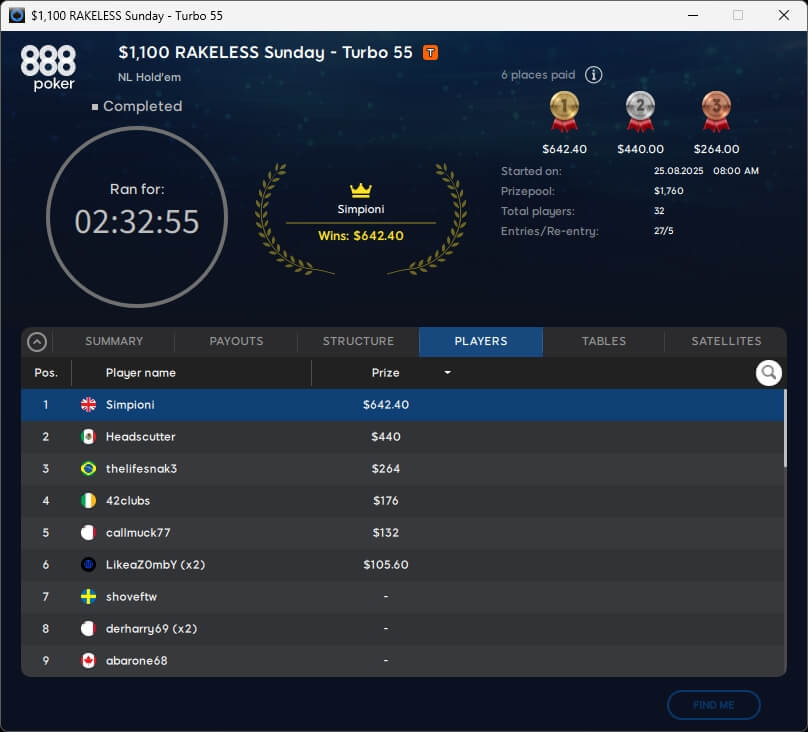 Jokura setzte sich zudem im $215 Sunday Big Shot für weitere $4.226,04 durch. Runner-up wurde Neeno1990 (2./$2.879,28). 888poker-Markenbotschafter Ian „Simpioni“ Simpson ($642,40) sicherte sich den Titel im $55 Turbo.