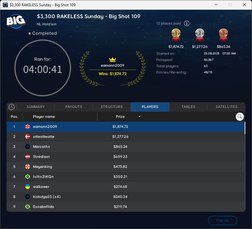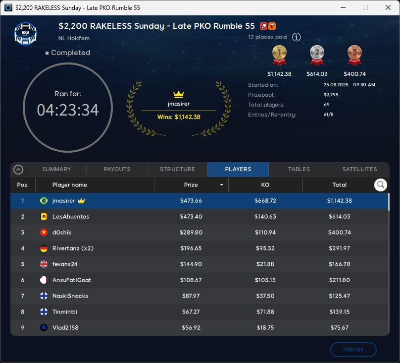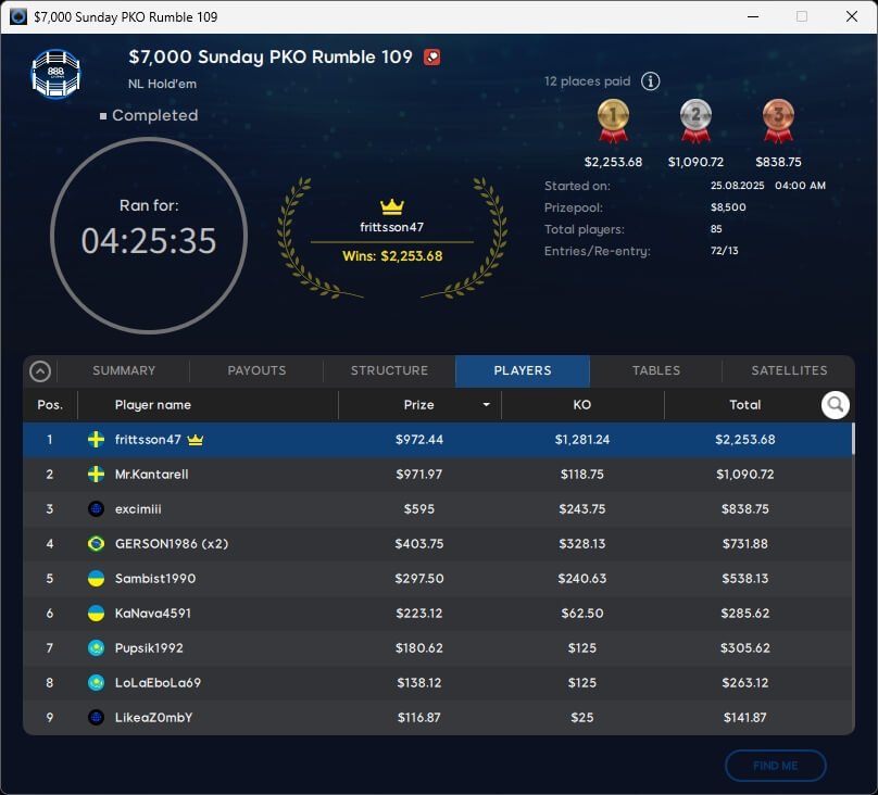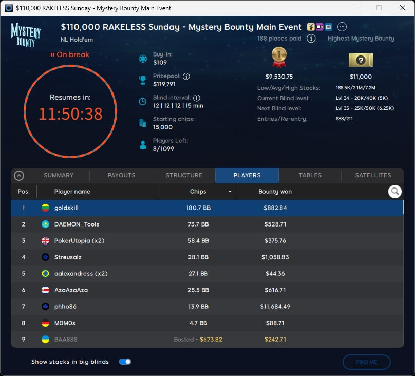 Zum $109 Mystery Bounty Main Event traten 888 Spieler an. Inklusive der 211 Re-Entries lagen $119.791 in der Mitte. Die $10k-Bounty ist bereits vergeben und ging an phho86, der es an den Final Table schaffte. Ebenfalls für das Finale zurückkehren werden Streusalz und MOMOs.