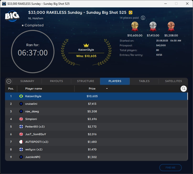Auf 888poker gab es den Rakeless Sunday. Im $525 Sunday Big Shot trugen 57 Spieler $42.000 an Preisgeldern zusammen. Der Brasilianer Léo Jokura schnappte sich den Titel sowie eine Siegprämie in Höhe von $10.605.