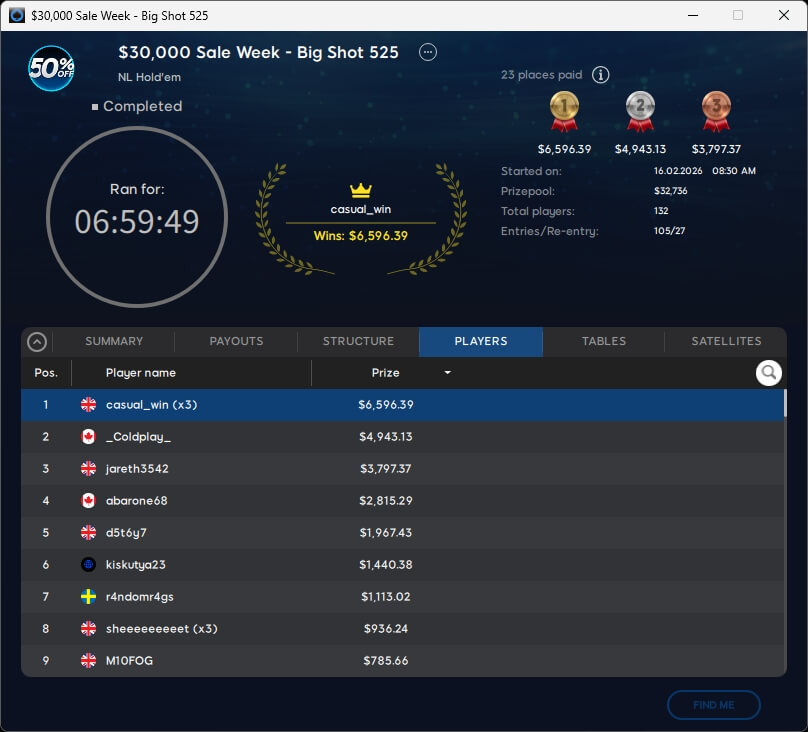 Péter Traply (6./$1.440,38) und Aaron Barone (4./$2.815,29) schafften im $525 Big Shot ebenfalls den Sprung an den Final Table. Dort setzte sich am Ende casual_win ($6.596,39) gegen _Coldplay_ (2./$4.943,13) durch.
