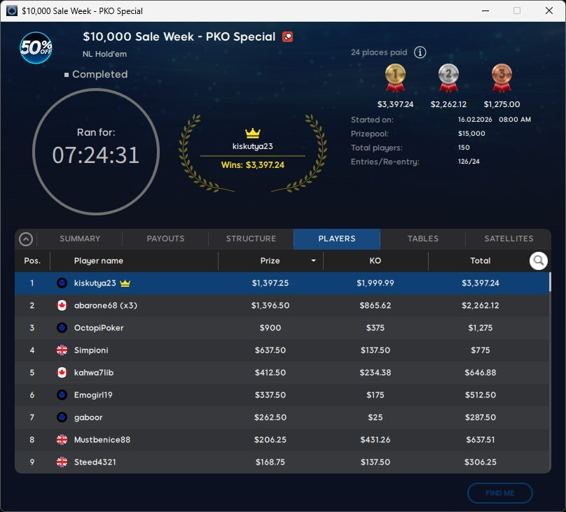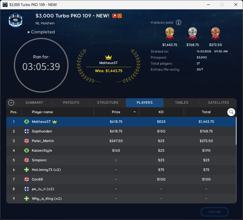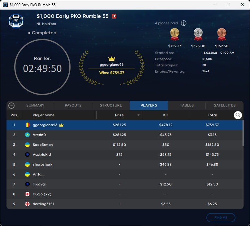 Die $10k-Bounty wurde bereits vergeben und ging an den Rumänen ciumpilic (61./$10.220,64). Acht Spieler überstanden den Cut und werden heute um den Sieg spielen. Mit am Start sein wird TLuther aus Deutschland.