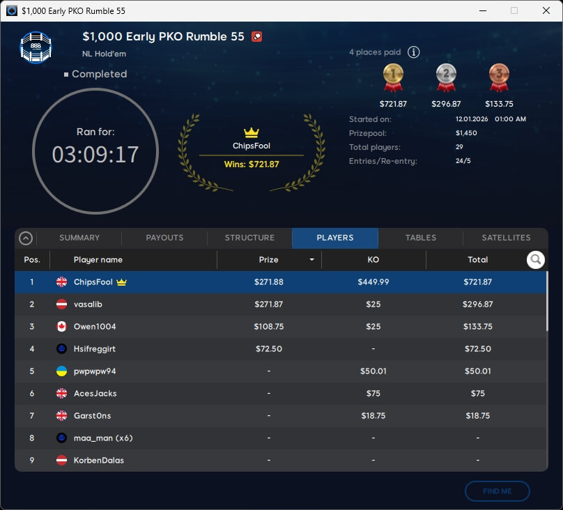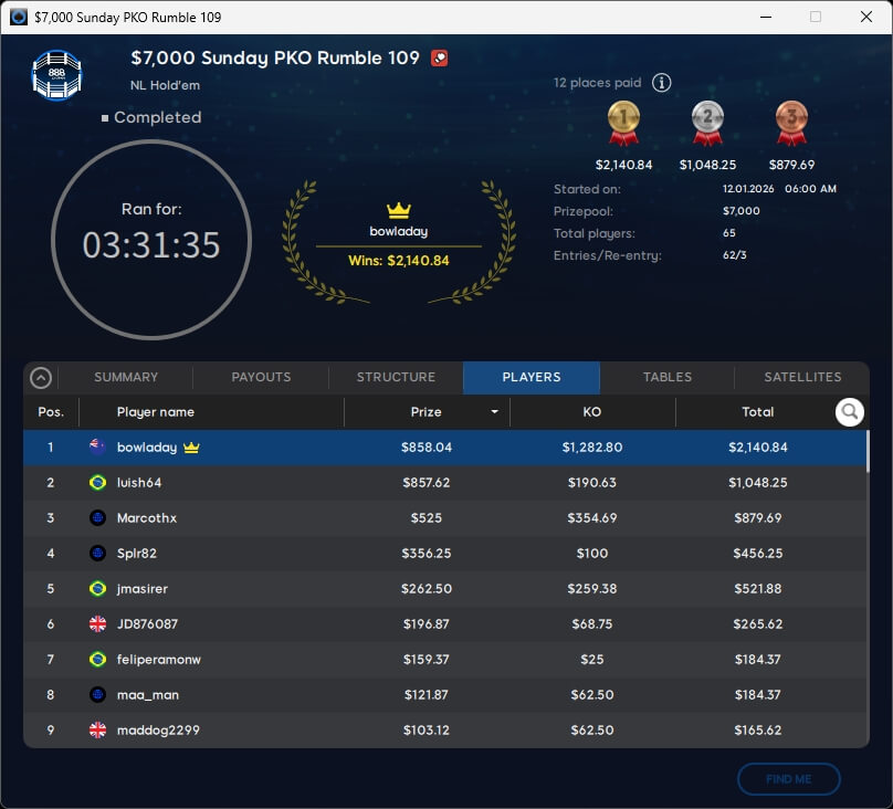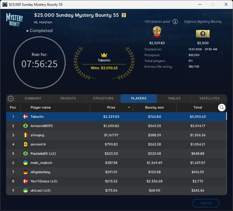 Im $109 Mystery Bounty Main Event trugen 796 Teilnehmer $103.400 zusammen. Die $10k-Bounty ging an Caroninh88 (29./$10.590,19) aus Dänemark. Die acht verbliebenen Spieler werden heute um den Titel kämpfen.
