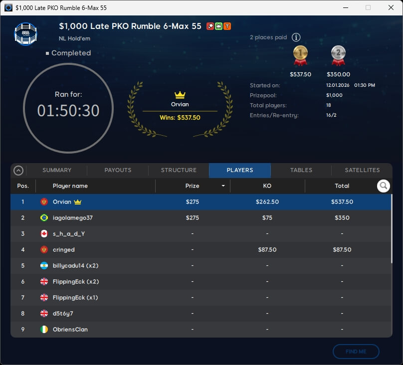 Im $215 Sunday Big Shot schaffte es Péter Traply ebenfalls an den Final Table. Dort belegte der Ungar Rang 4 für $620. Den Sieg schnappte sich der Kasache bounty8 ($2.263), 888poker-Markenbotschafter Ian „Simpioni“ Simpson belegte Rang 3 für $930.