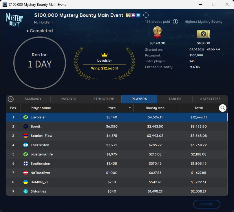 Am Ende sollte es auch einen brasilianischen Titelgewinner geben. Am Final Table setzte sich Lavoisier gegen Boedi_ ($8.493,50) durch und ging mit $12.666,11 vom Tisch. Rang 3 ging an den Armenier Scarlet_Flow ($8.368,08).