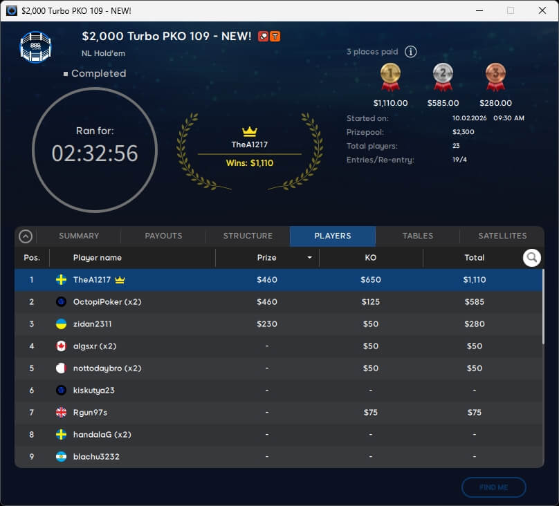 Zu Tag 2 im $109 Mystery Bounty Main Event kehrten acht verbliebene Teilnehmer auf 888poker zurück. Die $10k-Bounty wurde bereits am Starttag ausgespielt und ging an den Brasilianer muka_gaming (58./$10.192,61).