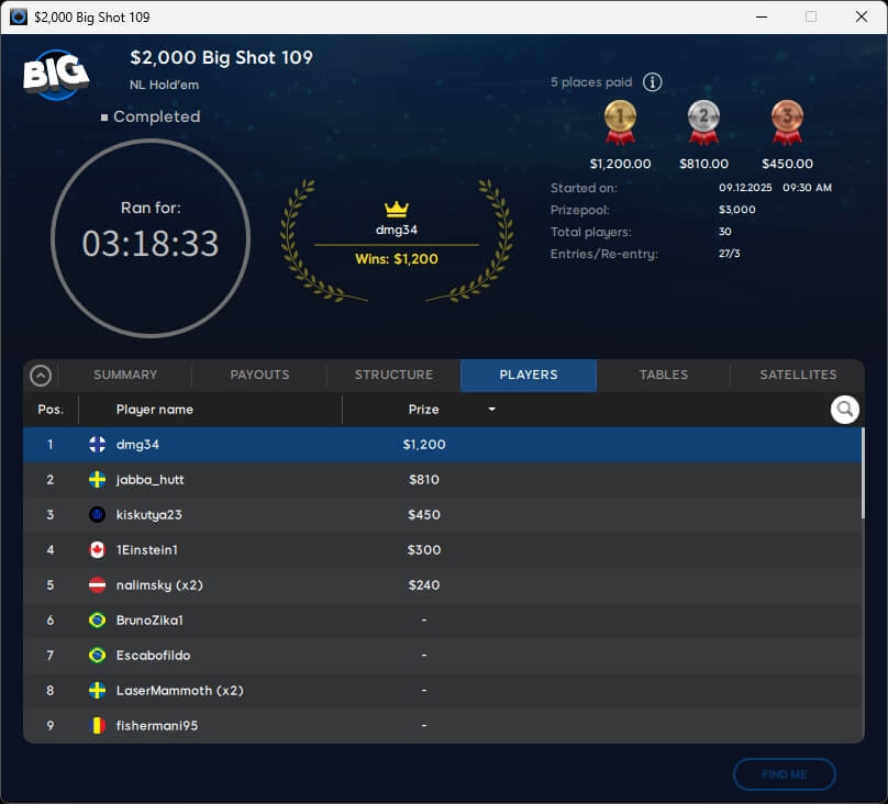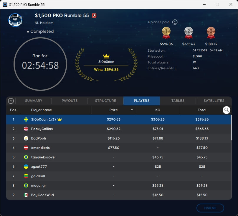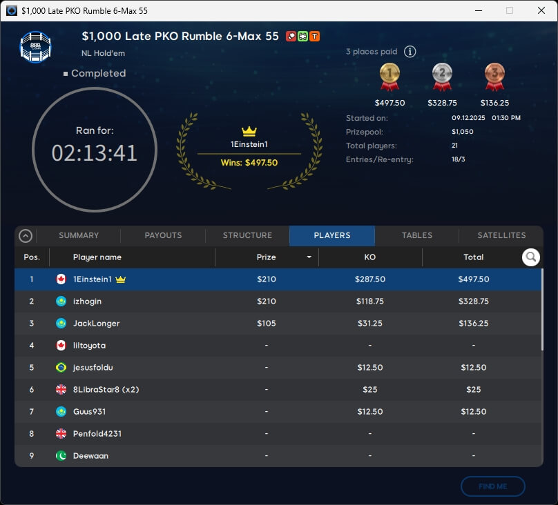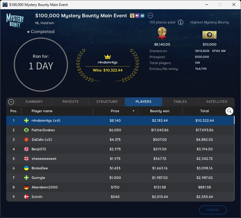Andreas „r4ndomr4gs“ Berggren legte einen Start-Ziel-Sieg hin. Der schwedische Poker-Pro ging mit $10.322,44 vom Tisch. Aufgrund der $10k-Bounty war Runner-up FatherSnakes ($17.093,86) allerdings der große Gewinner.