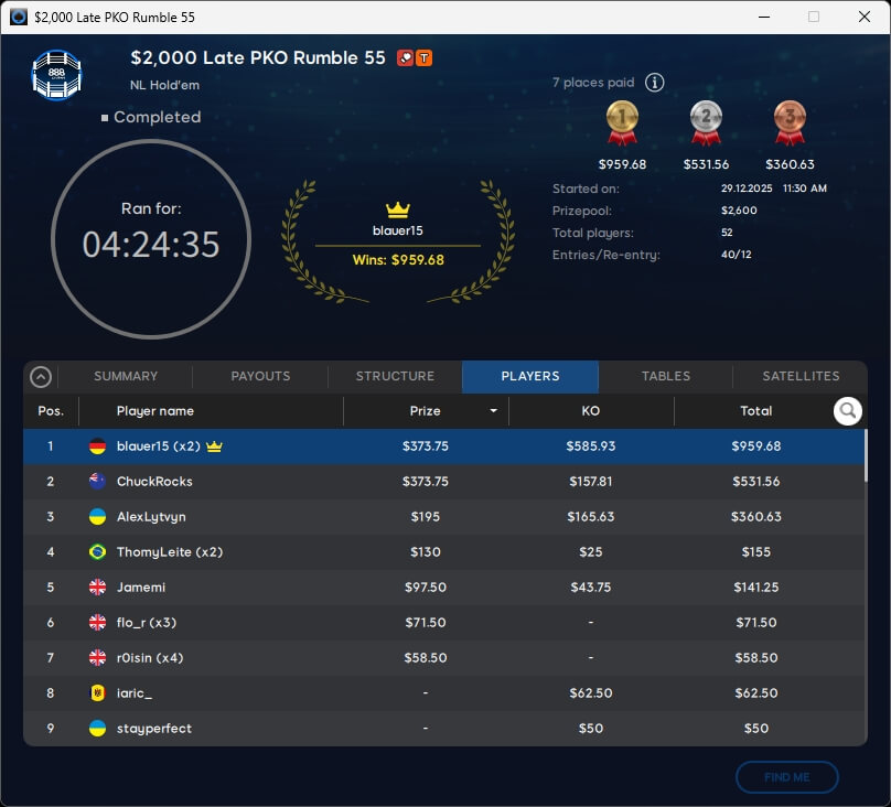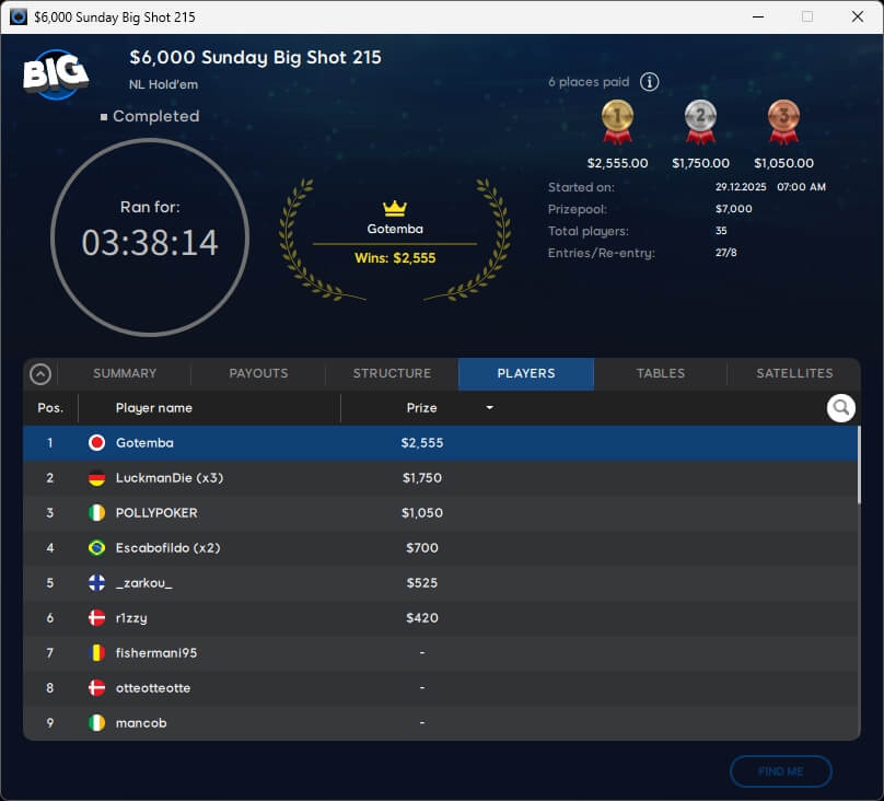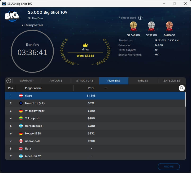 Zum $100.000 GTD Mystery Bounty Main Event traten 790 Spieler an. Dazu kamen 191 Re-Entries, sodass es bei der garantierten Summe blieb. El_hombre (13./$10.781,60) aus Mexiko schnappte sich die $10k-Bounty, verpasste jedoch den Final Table. Die acht Finalisten werden heute um den Sieg spielen.