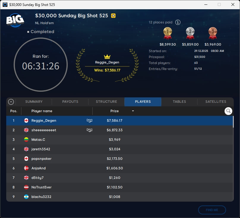 Der Sunday Grind auf 888poker brachte die übliche Action. Im $215 Sunday Big Shot schrammte LuckmanDie (2./$1.750) aus Deutschland knapp an einem Sieg vorbei. Das $525 Sunday Big Shot machten Reggie_Degen ($7.586,17) und Tom „sheeeeeeeeet“ Hall (2./$6.872,33) nach Heads-Up-Deal unter sich aus.