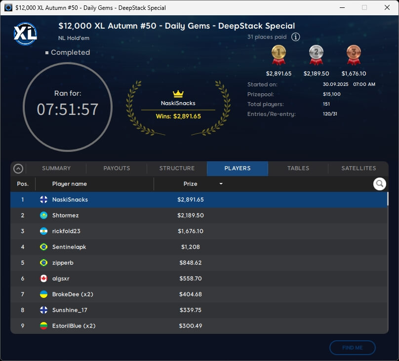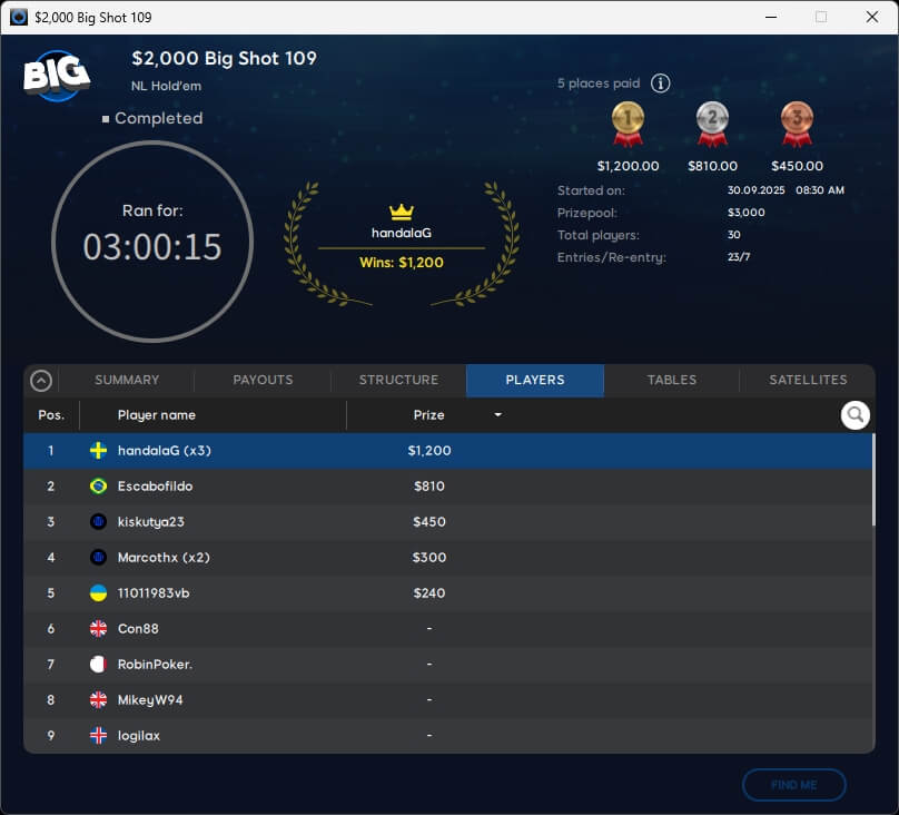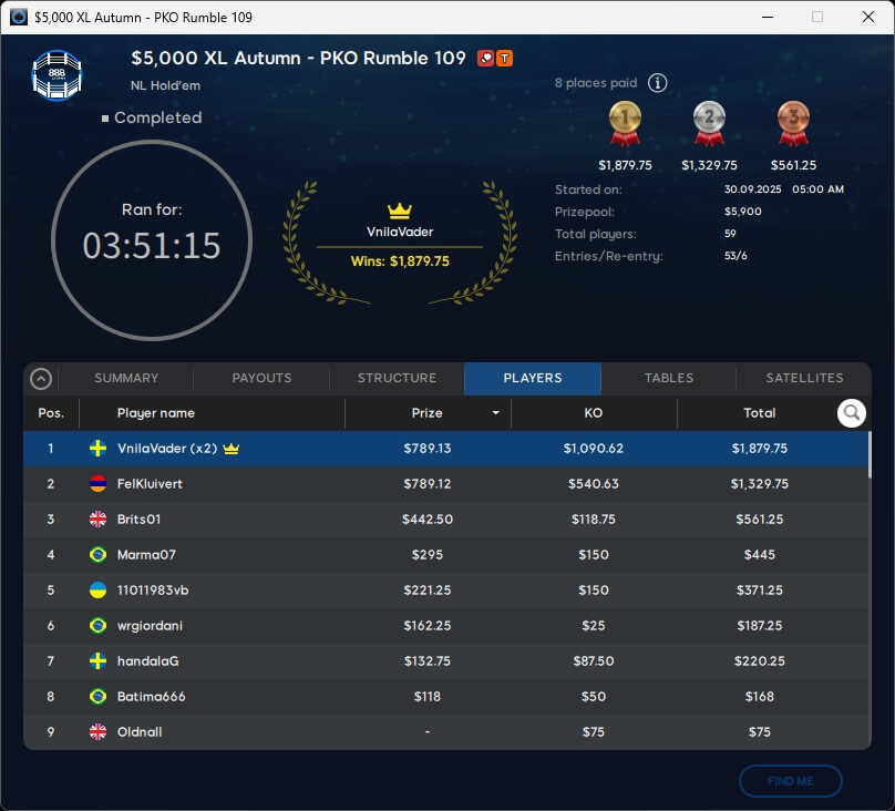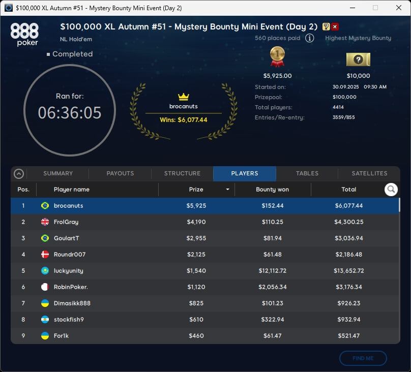 Im $55 Big Shot Special der XL Autumn Series auf 888poker machten mit resilience32 ($2.446,96) und KellerA (2./$1.828,30) zwei Spieler aus unseren Breitengraden den Sieg unter sich aus. Im $25 Mystery Bounty Main Event ging der Sieg am Ende an den Brasilianer brocanuts ($6.077,44). Großer Bounty-Gewinner war der Kasache luckyunity (5./$13.652,72).
