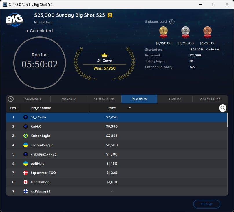 Ebenfalls um garantierte $25.000 wurde im $525 Sunday Big Shot gespielt. Dort kamen 43 Starter und sieben Re-Entries zusammen. Im Heads-up setzte sich St_Corvo ($7.950) gegen Kabb0 (2./$5.350) durch. Rang 3 ging an den Brasilianer Léo „KaizenStyle“ Jokura ($3.625).