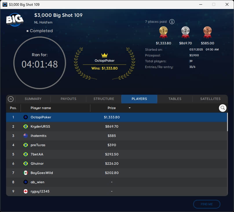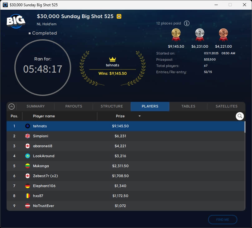 Das $525 Sunday Big Shot auf 888poker lockte in dieser Woche 52 Spieler an. Dazu kamen 15 Re-Entries, sodass um $33.500 gespielt wurde. Den Sieg sowie $9.145,50 sicherte sich tehnats, Runner-up wurde Ian Simpson ($6.231).
