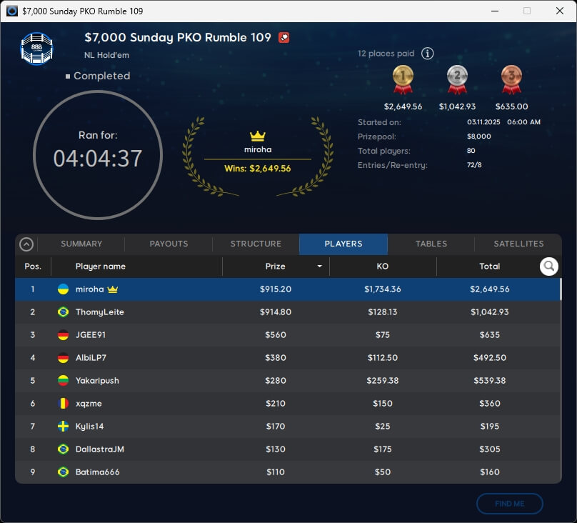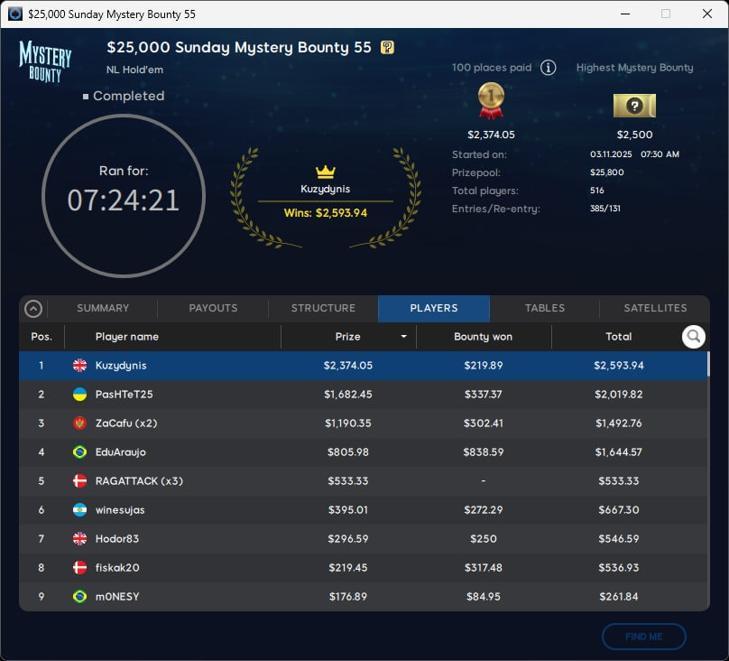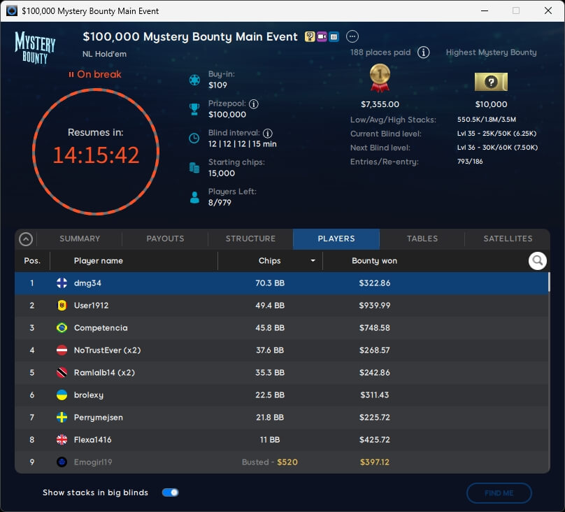 Zum $109 Mystery Bounty Main Event fanden sich 793 Teilnehmer ein. Weitere 186 Re-Entries reichten nicht, um die $100.000 GTD zu knacken. Die $10k-Bounty wurde bereits geknackt und ging an Stache (123./$10.105) aus Kanada. Acht Spieler werden heute um den Titel spielen. Mit am Start sein wird Poker-Pro Jerry „Perrymejsen“ Ödeen, der von Rang 7 aus in die Entscheidung geht.