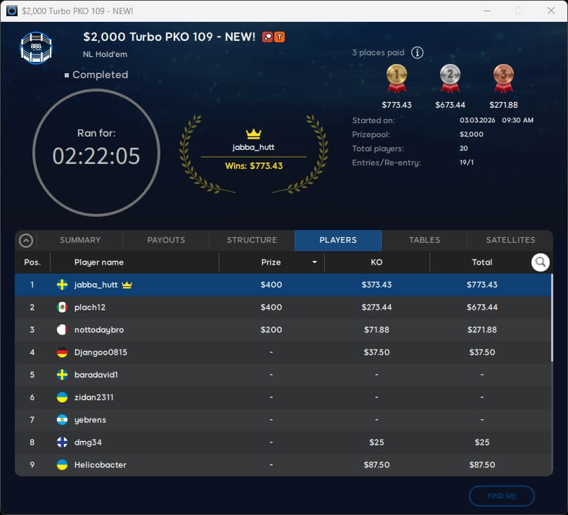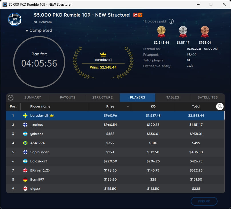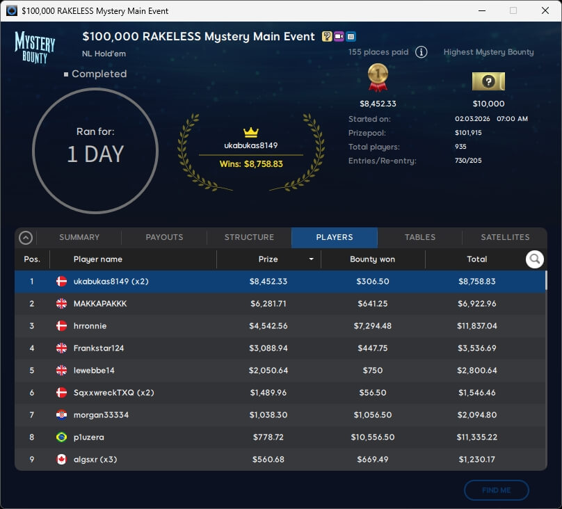 Den Sieg sicherte sich am Ende der Däne ukabukas8149 ($8.758,83). Aufgrund der Kopfgeldprämien ging sein Landsmann hrronnie mit $11.837,04 für Rang 3 vom Tisch. Runner-Up wurde der Brite MAKKAPAKKK ($6.922,96).