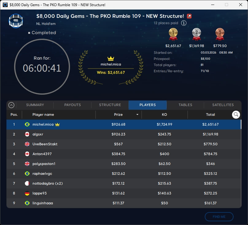 Das $109 Mystery Bounty Main Event ging mit acht verbliebenen Spielern in Day 2. Zu den Finalisten gehörte auch p1uzera ($11.335,22). Der Brasilianer hatte sich an Tag 1 die $10k-Bounty gesichert, kam jedoch nicht über den Final Table Min Cash hinaus.