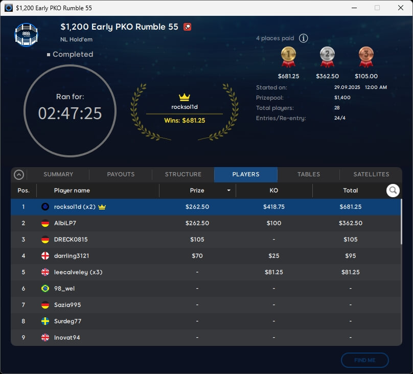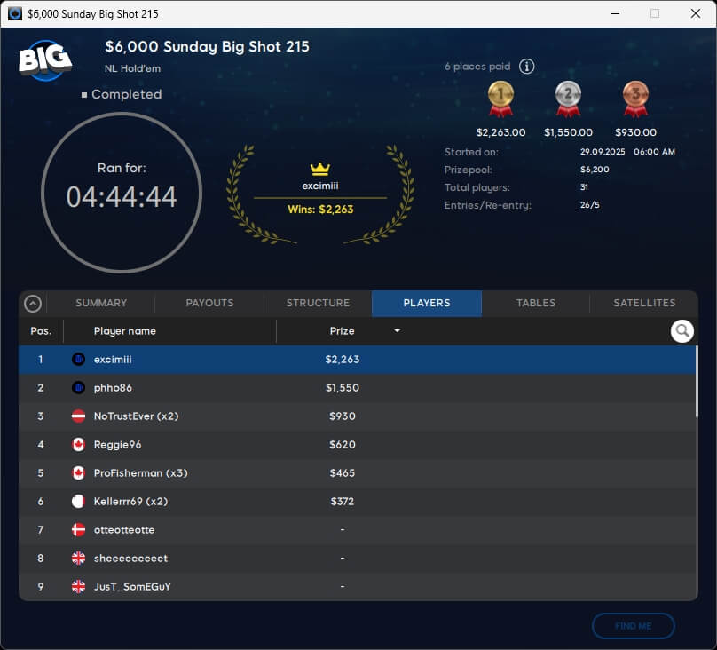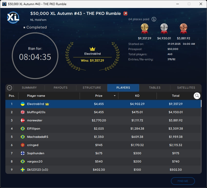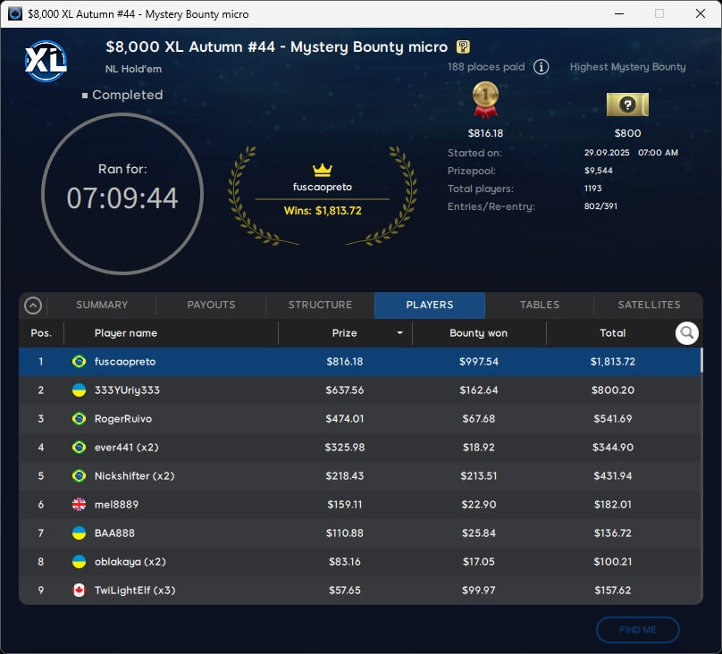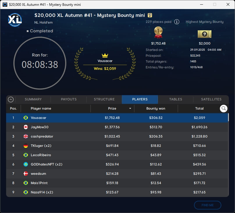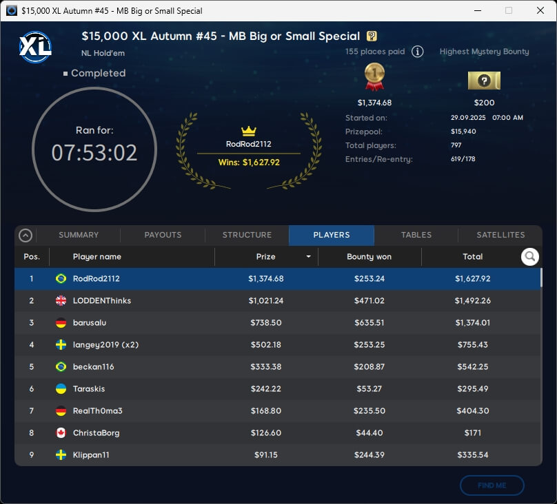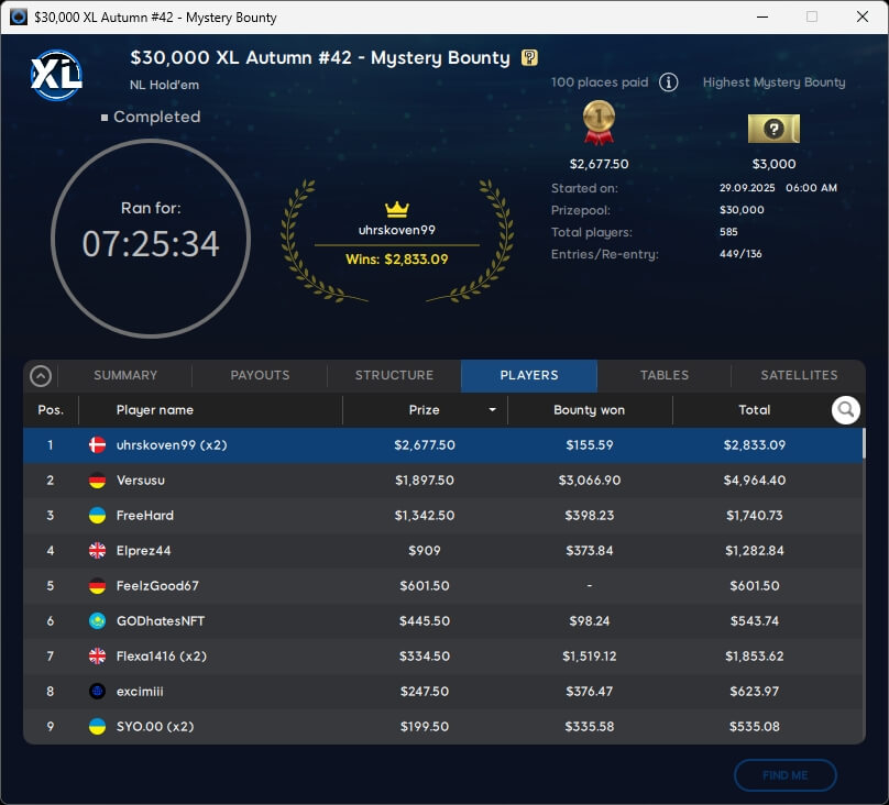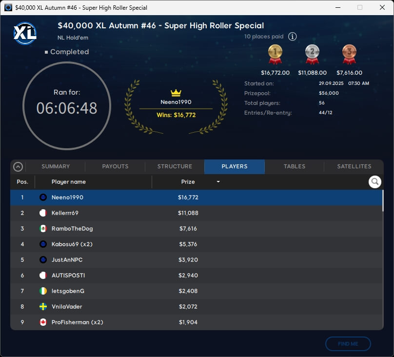 Die XL Autumn Series 2025 neigt sich dem Ende zu. Mit Neeno1990 ($16.772; $1.050 Super High Roller Special), Versusu (2./$2.833,09; $55 Mystery Bounty) und barusalu (3./$1.374,01; $22 MB Big or Small Special) gab es drei Sieger aus unseren Breitengraden.