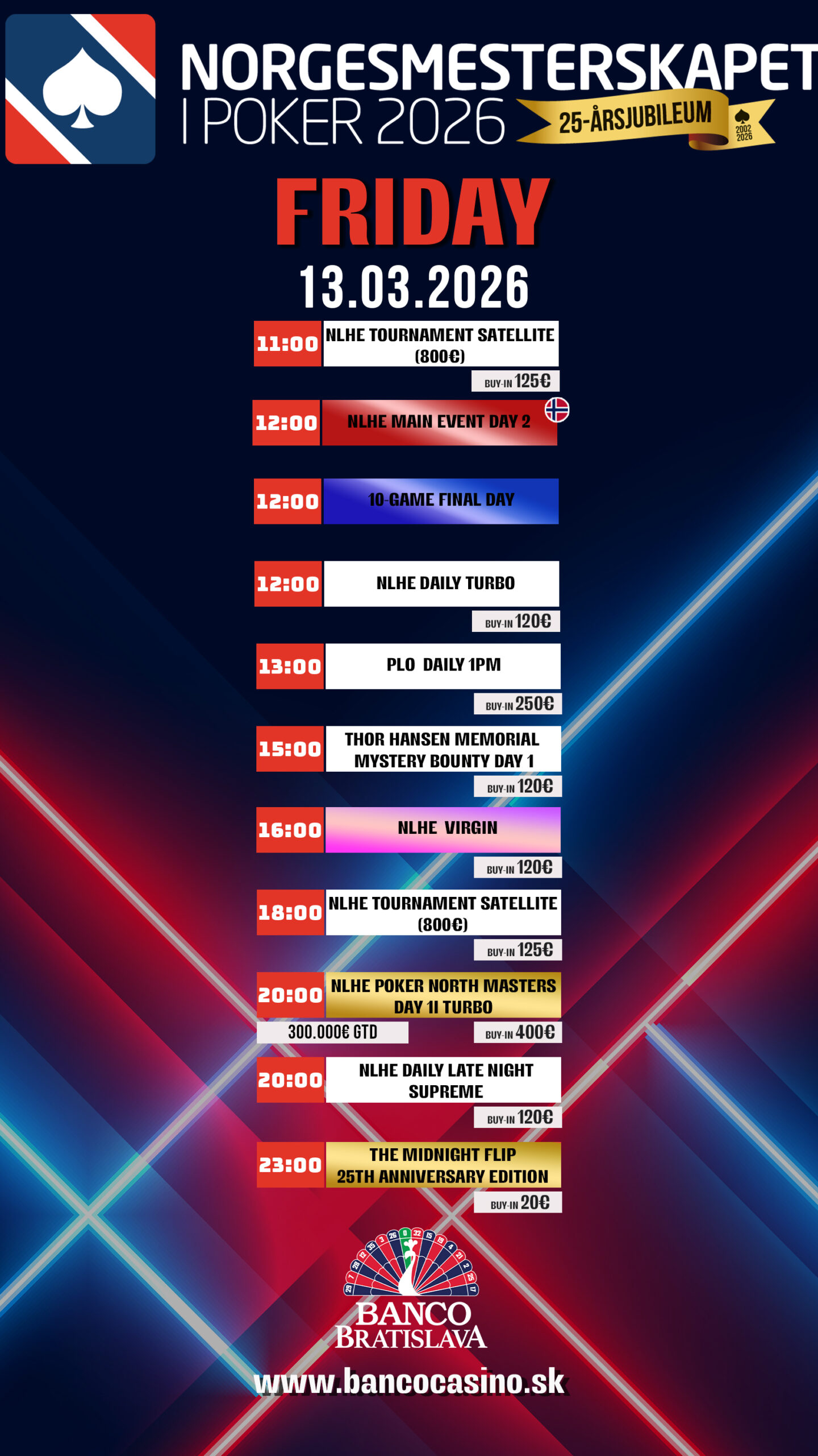 Ja auch heute ist der Tunierplan so richtig voll und mit Sicherheit können sich auch die Cash Games wieder so richtig sehen lassen. Aber um 20 Uhr startet auch der Turbo Flight (15′) der PNM. Und morgen wird um 15 Uhr Tag 1J (30′) gestartet, dann ist um 20 Uhr noch Tag 1K (15′) und dann sich auch schon Schluss mit Startmöglichkeiten. Denn am Sonntag geht es um 12 Uhr ins Finale. Bei den Cash Games wird täglich ab € 1/3 NLH bzw. € 2/2 PLO gestartet. Bei Fragen könnt Ihr Euch gerne an Marketing Manager Jan Packa (englisch) wenden, alles Weitere findet Ihr unter bancocasino.sk.