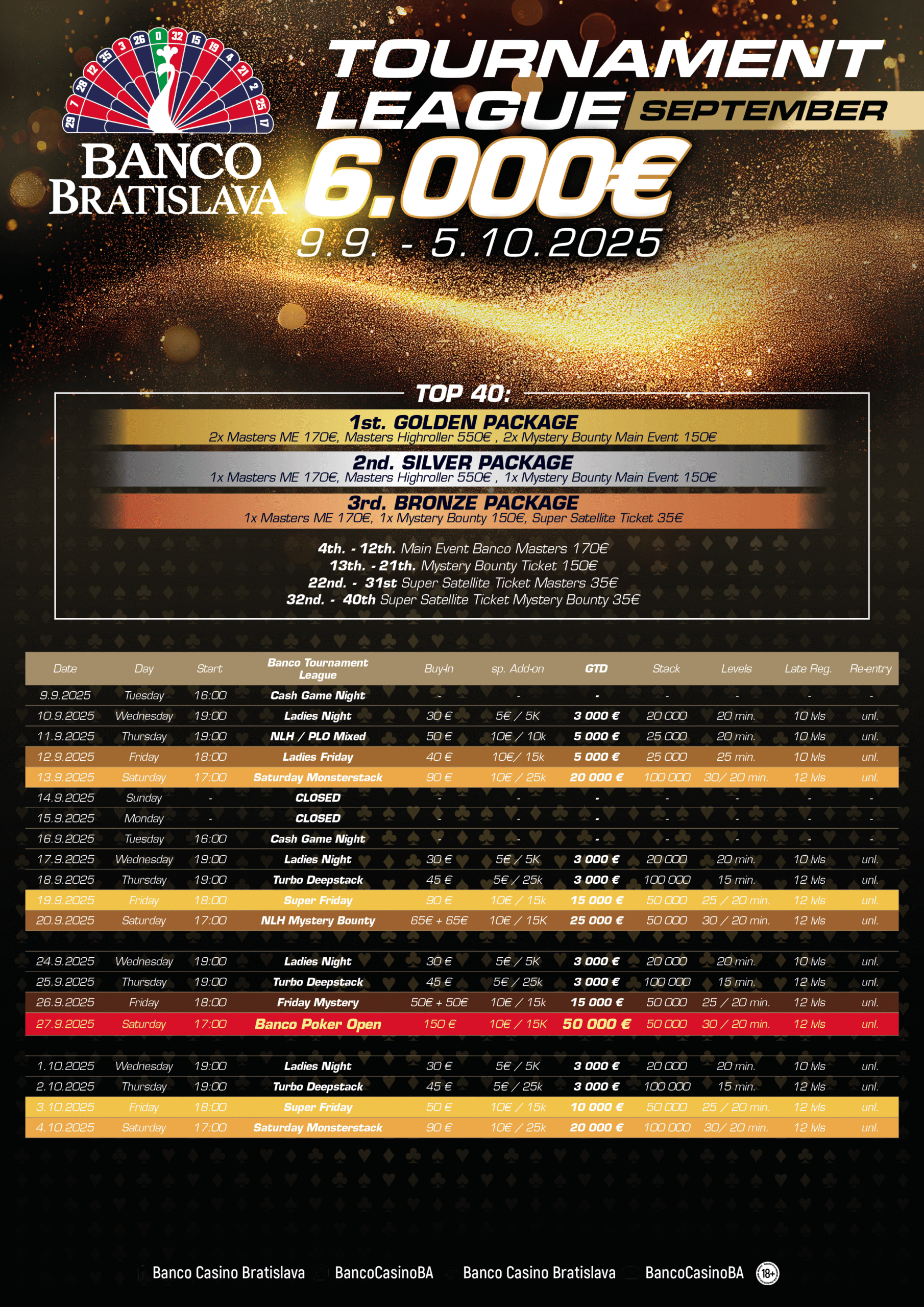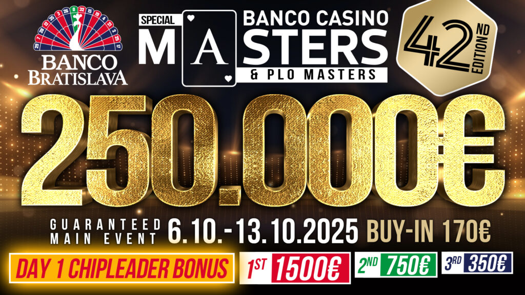 Die bereits 42. Ausgabe der Banco Casino Masters wartet von 6. bis 13. Oktober, im Banco Casino Bratislava. Bei einem Buy-In von € 170 spielt man um garantierte € 250.000, Auch eine neue Ausgabe der PLO Masters darf nicht fehlen.