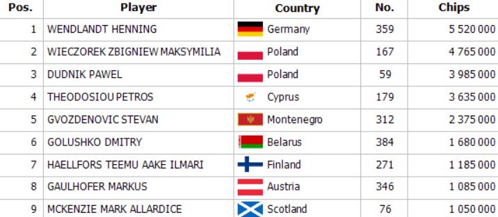 Henning Wendlandt führt heute den Final Table beim € 500 + 50 Main Event bei „The Festival“ im Banco Bratislava an, auch Markus Gaulhofer kann noch auf die Siegprämie von € 45.525 hoffen.
