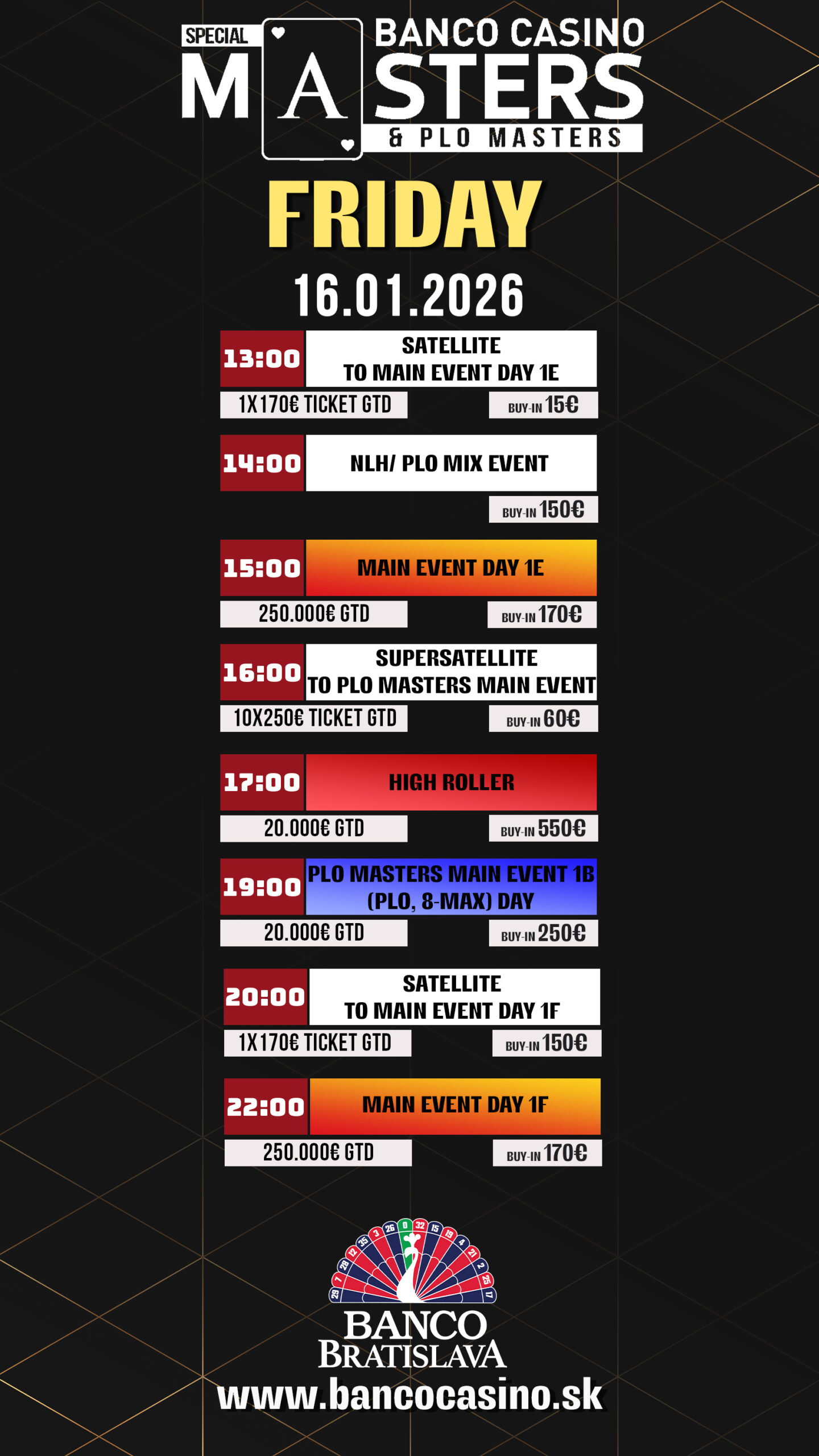 Für 25 Spieler geht es heute ins Finale, wo die Late Reg auch noch drei Levels lang offen ist. Später erhöht sich die Leveldauer auf 40 Minuten. Im Fokus steht heute aber das Main Event. Bei den € 170 Banco Casino Masters (€ 250.000 GTD) stehen heute drei Flights an (40k/30 bzw. 15′). Bei den Cash Games wird wie immer ab den Blinds € 1/3 NLH bzw. € 2/2 PLO gespielt. Bei Fragen könnt Ihr Euch gerne an Marketing Manager Jan Packa (englisch) wenden, alles weitere findet Ihr unter bancocasino.sk.