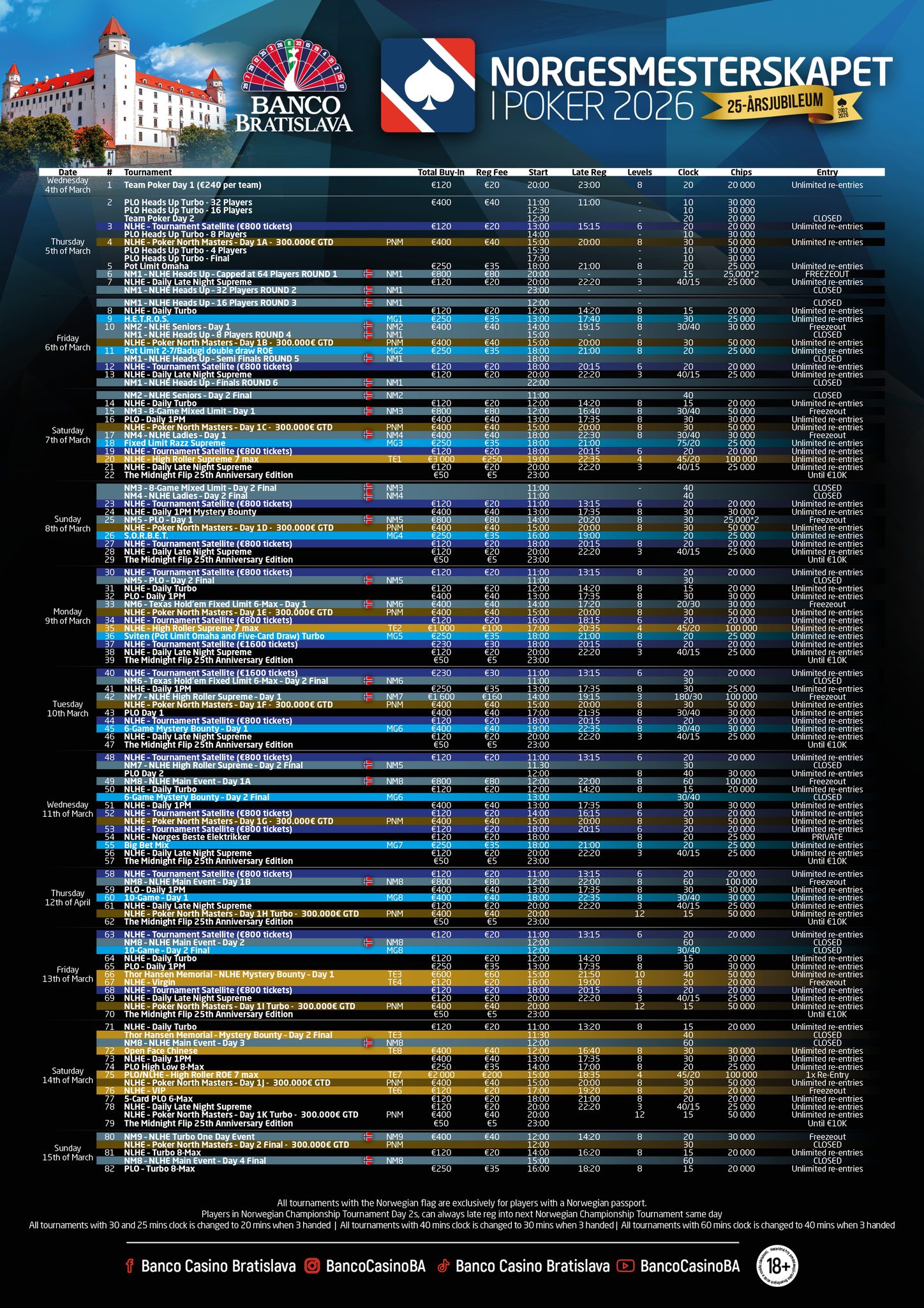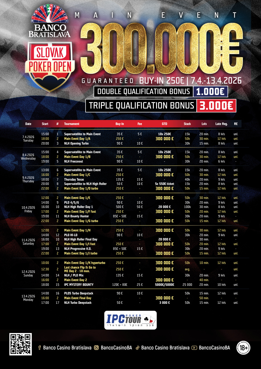Heute wird um 15 Uhr Tag 1C gestartet, dazu kommt um 22 Uhr der Turbo Flight 1D. Während die PLO Championship bereits um 14 Uhr ins Finale geht, startet um 20 Uhr das € 450 + 50 High Roller (€ 20.000 GTD/100k/30′). Das Turnier wierd ebenfalls über zwei Tage gespielt, die Late Reg ist auch morgen noch offen. Die Cash Games starten täglich bei € 1/3 NLH bzw. € 2/2 PLO. Bei Fragen könnt Ihr Euch gerne an Marketing Manager Jan Packa (englisch) wenden, alles Weitere findet Ihr unter bancocasino.sk.