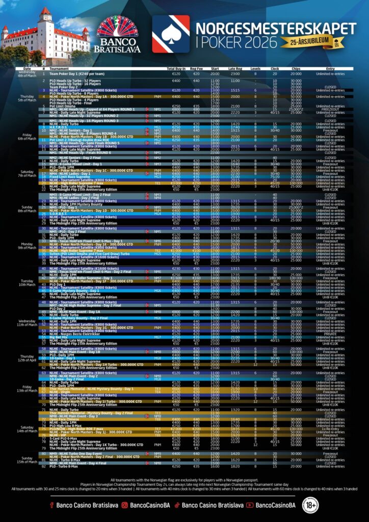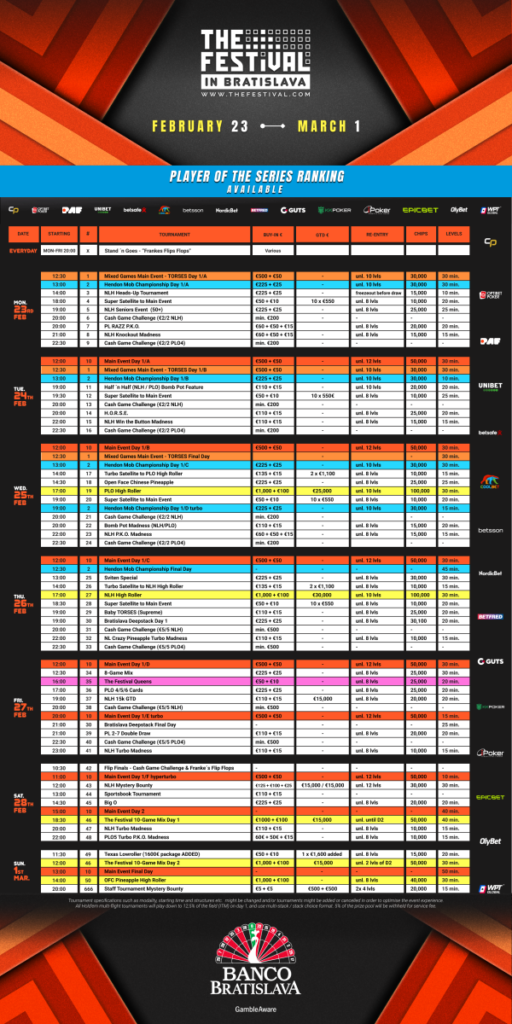 Ob das weiterhin so ist, wird sich zeigen, denn heute stehen drei Flights an. Um 12 und um 17 Uhr geht es in die regulären Flights (100k/30′), um 22 Uhr gibt es den Turbo Flight (15′). Auch morgen werden noch drei Flights angeboten, am Sonntag gibt es den letzten Turbo und die Flips. Neben dem Main Event gibt es heute das Finale beim € 450 + 50 High Roller (€ 20.000 GTD/100k/30′), hier ist die Late REg noch bis Ende Level 13 offen. Dazu kommt das € 90 + 10 NLH/PLO Mix (30k/20′). Die Cash Games starten täglich bei € 1/3 NLH bzw. € 2/2 PLO. Bei Fragen könnt Ihr Euch gerne an Marketing Manager Jan Packa (englisch) wenden, alles Weitere findet Ihr unter bancocasino.sk.