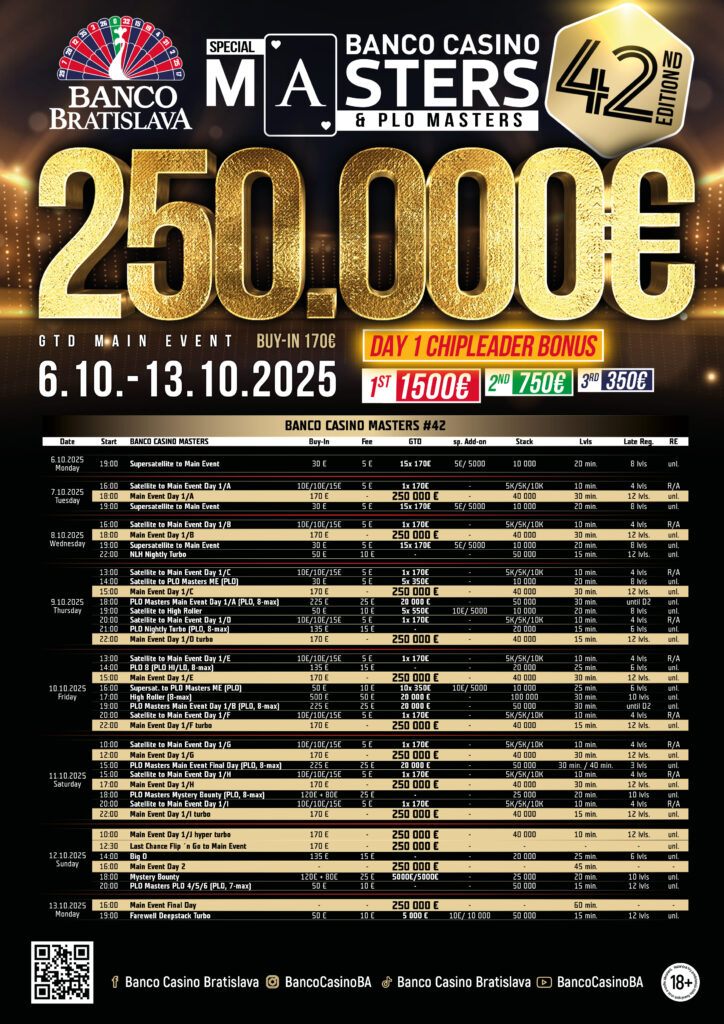 Noch ist die € 250.000 Preisgeldgarantie bei den € 170 Banco Casino Masters im Banco Casino Bratislava nicht geknackt, es gibt heute aber noch den Turbo Flight und die Flips.