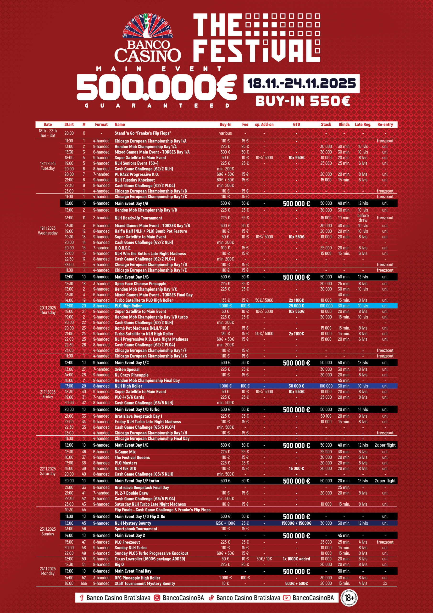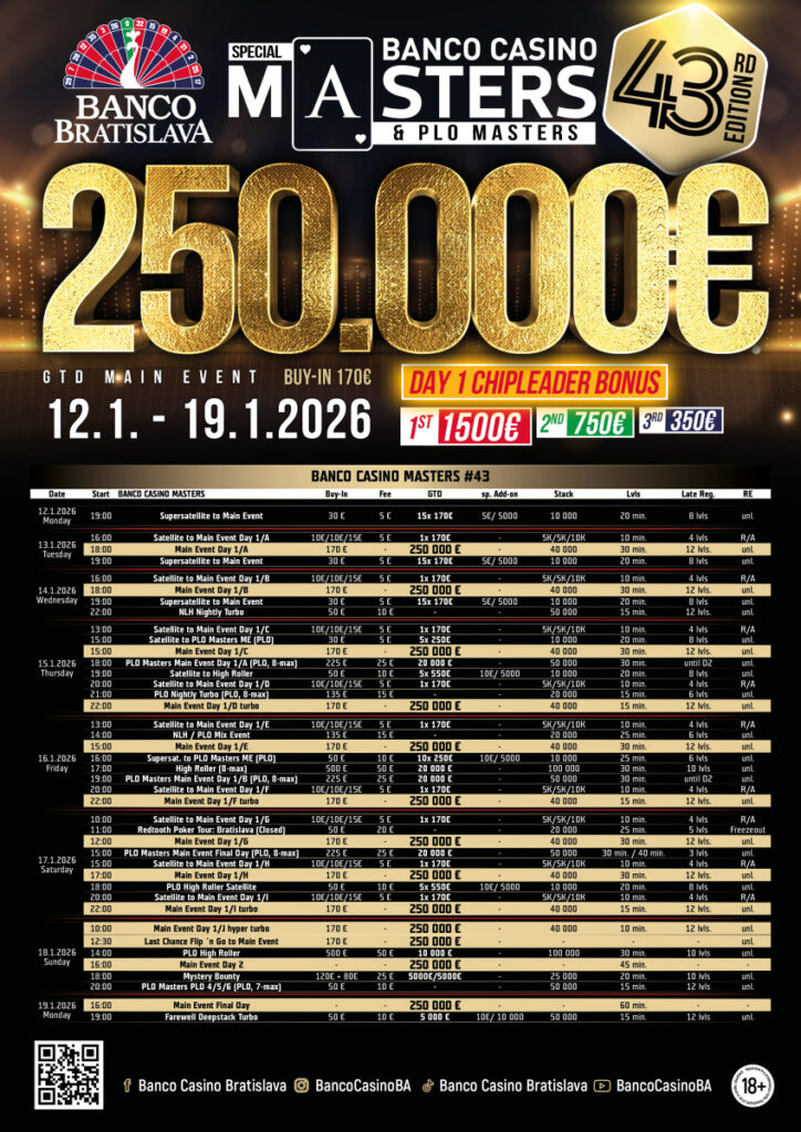 Heute um 10 Uhr startet der Turbo Flight, dazu kommen noch die Flips, ehe es dann um 15 Uhr in Tag 2 geht. Auch heute ist der Turnierplan generell sehr voll, so wartet zB auch das € 150 + 100 + 25 Mystery Bounty (30k/30′) mit € 30.000 GTD auf.  Bei den Cash Games wird wie immer ab den Blinds € 1/3 NLH bzw. € 2/2 PLO gespielt. Bei Fragen könnt Ihr Euch gerne an Marketing Manager Jan Packa (englisch) wenden, alles weitere findet Ihr unter bancocasino.sk.