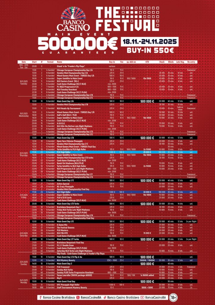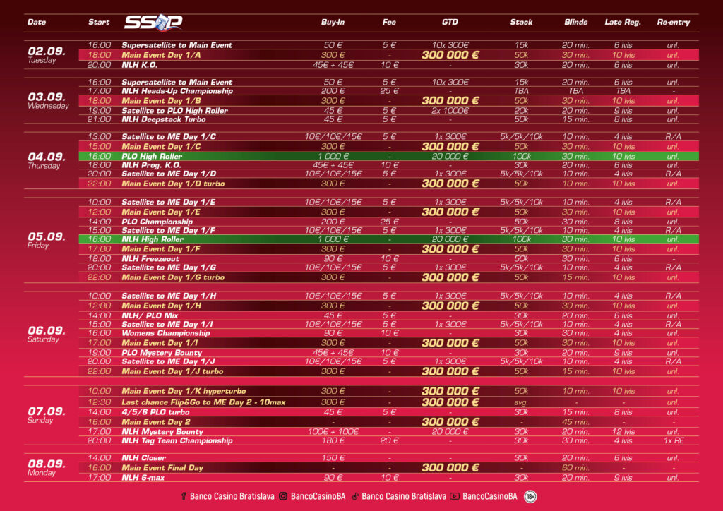 Am Dienstag geht es mit dem € 300 SSOP Main Event (€ 300.000 GTD) los, eine Woche feine Pokeraction steht bei der SSOP an. (siehe Banco Poker: Slovak Series of Poker – Die Slowakische Meisterschaft kommt mit € 300.000 GTD!)