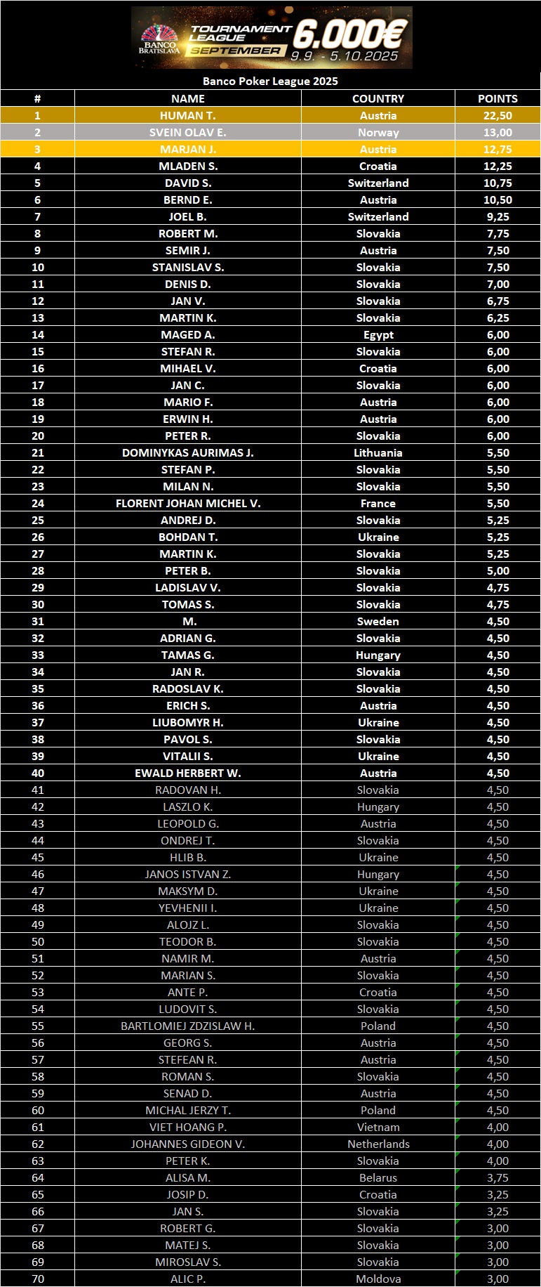 Bis die 42. Banco Casino Masters am 6. Oktober eröffnet werden, gibt es die Tournament League. Bei jedem Turnier werden Punkte gesammelt und in der ersten Woche konnte sich dabei der Österreicher Human T. gleich die Führung vor Mr. Coolbet, auf Rang 2 liegt Marjan J.