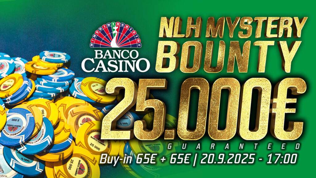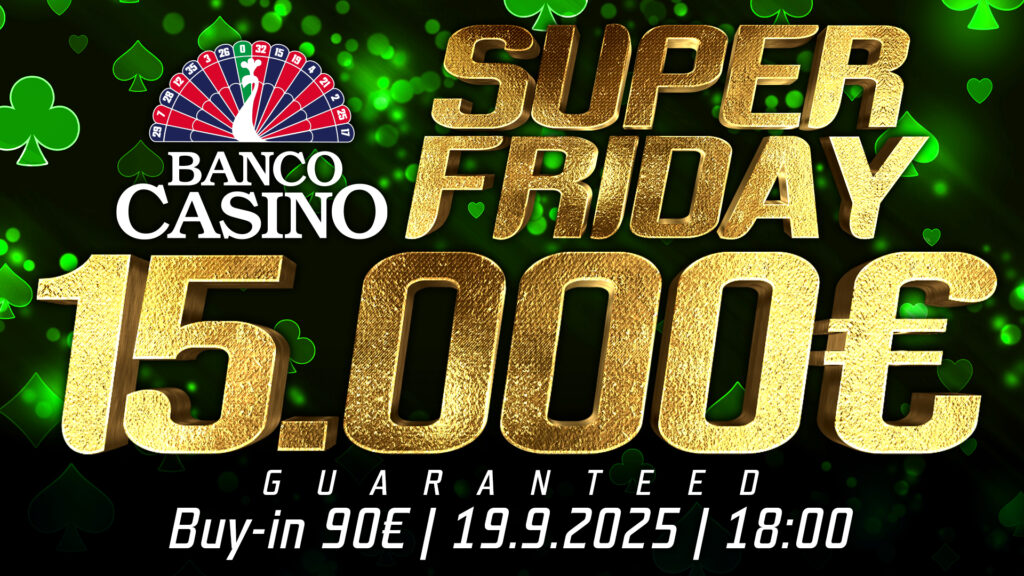 Die Punktejagd geht weiter, dieses Wochenende unter anderem mit dem € 90 Super Friday (€ 15.000 GTD/50k/25-20′) am Freitag und dem € 65 + 65 Mystery Bounty (€ 25.000 GTD/50k/30-20′) am Samstag. Bei den Turniere gibt es wie immer die Möglichkeit von € 10 Add-On für Bonus Chips. 10 % Fee und 5 % Staff werden auch bei Nichterreichen der Garantie abgezogen.