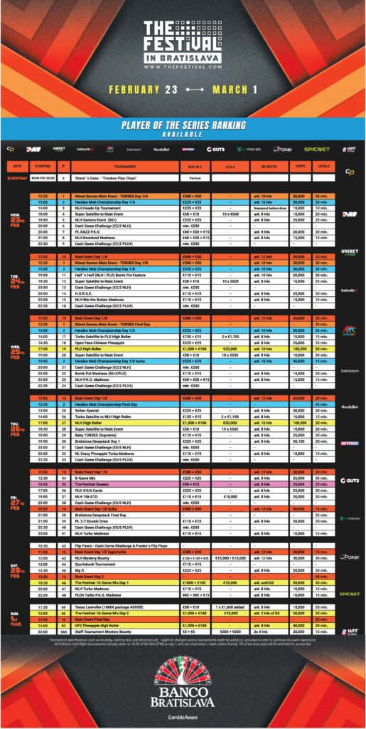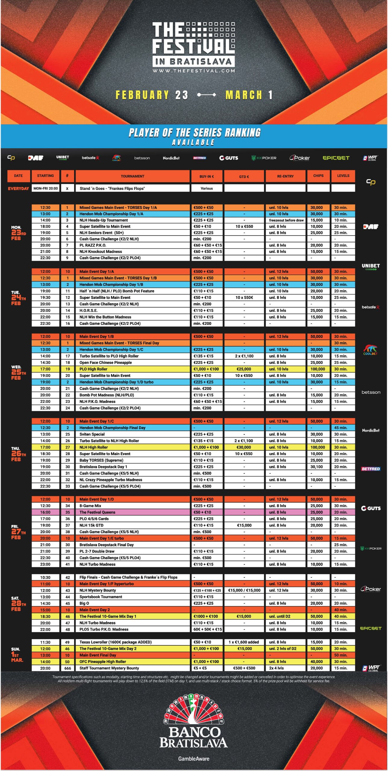 Wenn es eine Turnierserie gibt, die für Vielfalt steht, dann ist das „The Festival“. Von 23. Februar bis 1. März startet man im Banco Bratislava in die neue Saison. Mit jeder Menge NLH und Mixed Game Action. Und Pokerexklusiv präsentiert Euch ein ebenso exklusives POY-Ranking für die deutschsprachige Community.