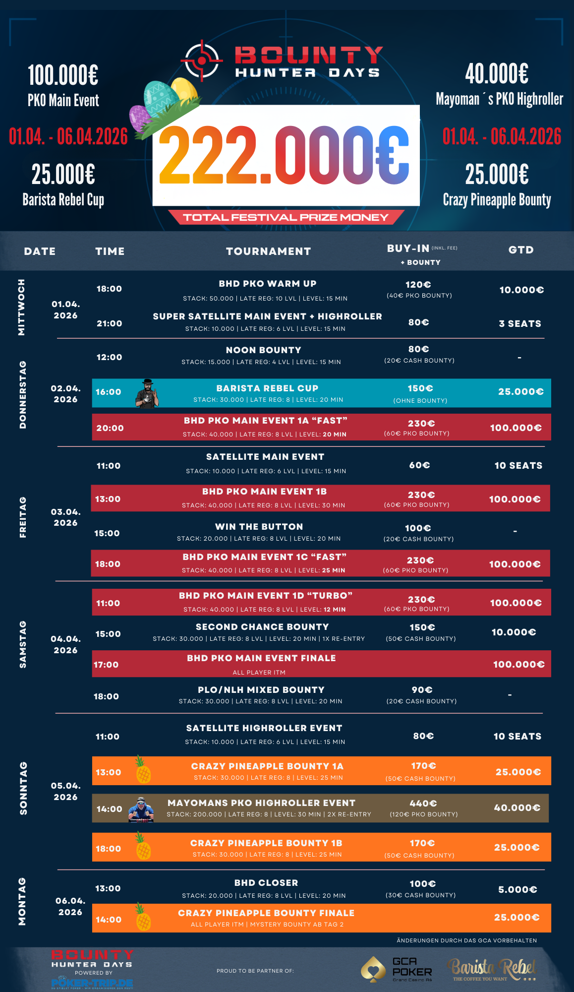 Schon jetzt könnt Ihr auch Euren Osterurlaub planen. Denn von 1. bis 6. April kommen die Bounty Hunter Days wieder ins GCA. Dann sogar mit € 222.0000 GTD. Und der Möglichkeit, Zimmer im neuen Hotel unmittelbar neben dem GCA zu buchen. Also schnell sein. Der Turnierplan hat an sich keine großen Überraschungen, aber wieder fette Highlights. Das € 140 + 60 + 30 PKO Main Event kommt mit garantierten € 100.000, dafür der € 150 Barista Rebel Cup mit garantierten € 25.000. Die warten übrigens auch beim allerersten zweitägigen (!) € 100 + 50 + 20 Crazy Pineapple am 5. und 6.April. Das gab es definitiv noch nie und wer dabei ist, schreibt auf jeden Fall Geschichte. Auch Mayoman darf mit dem € 440 PKO Bounty (€ 40.000 GTD) nicht fehlen.