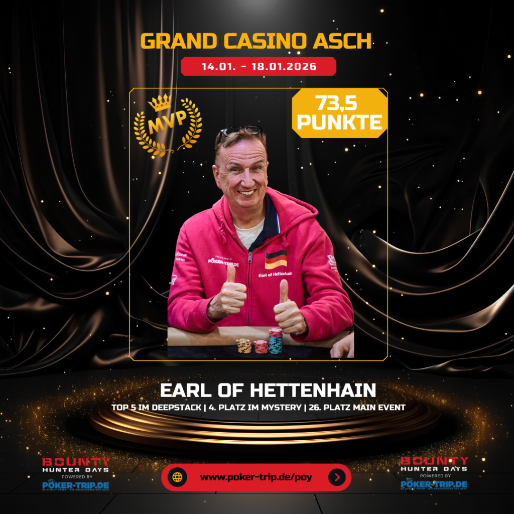 Die POY Wertung hat poker-trip.de schon mit unserem Pokerexklusiv No1 begonnen, der Earl von Hettenhain ist der „Chipleader“. Bis zum Jahresende gibt es noch zahlreiche Gelegenheiten für die 2026 Wertung Punkte zu sammeln. Die Wertung 2025 wird dieses Wochenende ausgespielt.