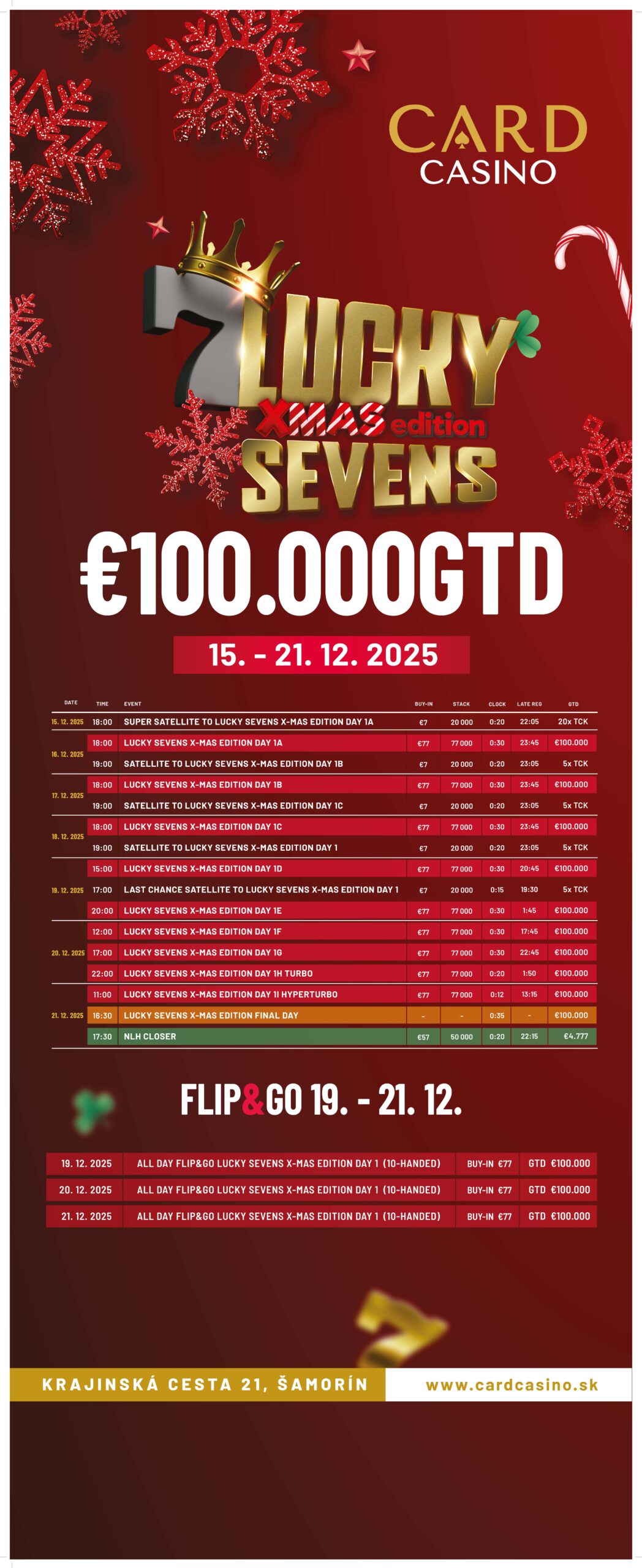 Heute wird gleich das nächste Festival – und gleichzeitig das letzte des Jahres eröffnet. Beim € 77 Lucky Sevens X-Mas Edition warten € 100.000 GTD, gespielt wird mit 77.000 Chips und 30 Minuten Levels. Bis zum Sonntag werden zahlreiche Startmöglichkeiten angeboten, das Finale ist am Sonntag. Bei den Cash Games geht es wie immer ab den Blinds € 1/2 NLH bzw. € 2/2 PLO los. Alle Details zum kompletten Angebot findet Ihr unter cardcasino.sk.