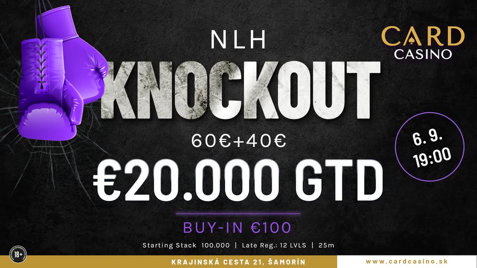Heute sorgt das € 60 + 40 NLH Knockout (€ 20.000 GTD/100k/25′) für Stimmung, bei den Cash Games wird wie immer ab € 1/2 NLH bzw. € 2/2 PLO gestartet. Alle Details zum kompletten Angebot findet Ihr unter cardcasino.sk.